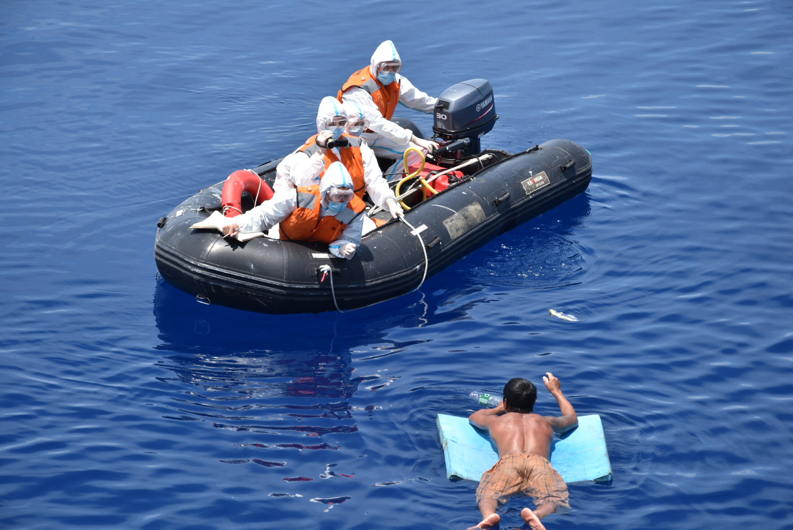 8月23日,记者从中国海警局获悉,18日中国海警5103舰在南海南部海域巡航时发现并救起1名越南籍渔民。8月23日,中国海警5103舰与越南海警9003船在事发海域附近会合,顺利完成被救渔民交接。图为8月18日,中国海警施放小艇对落水渔民实施救助,并为其提供食物和饮用水。