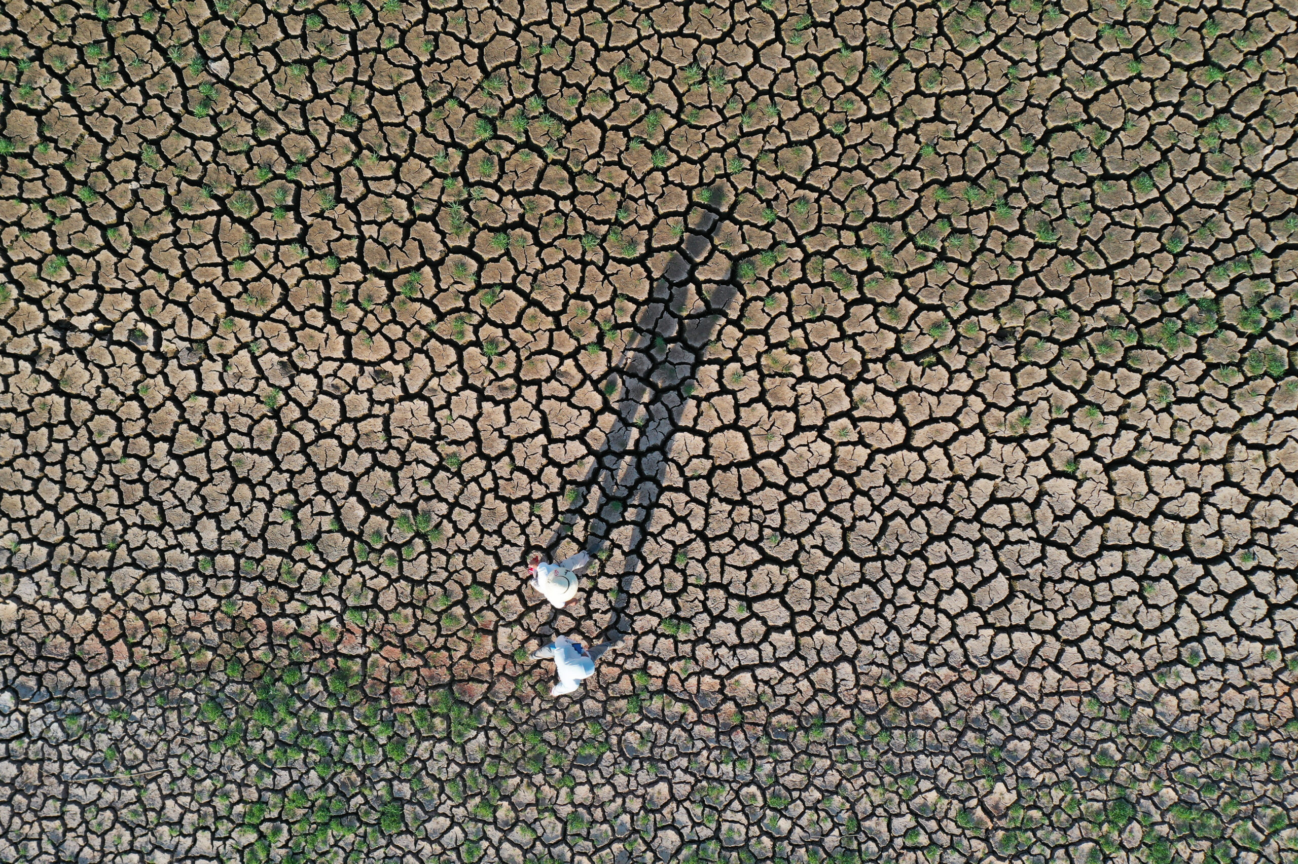 从枯水期到低枯水期再到即将到来的极枯水位,连日高温天气,不断“烤”验着中国最大淡水湖鄱阳湖及其周边。处暑节气,本应“出暑”的鄱阳湖流域白日最高温度依然逼近40摄氏度。中新社记者驱车前往鄱阳湖江西进贤段水域附近,只见原本烟波浩渺的鄱阳湖已明显“瘦身”,不少湖床露出开裂。远远望去,部分湖床变成“草原”。图为8月23日,在鄱阳湖江西省南昌市进贤县水域,两名男子行走在干涸开裂的湖床上。