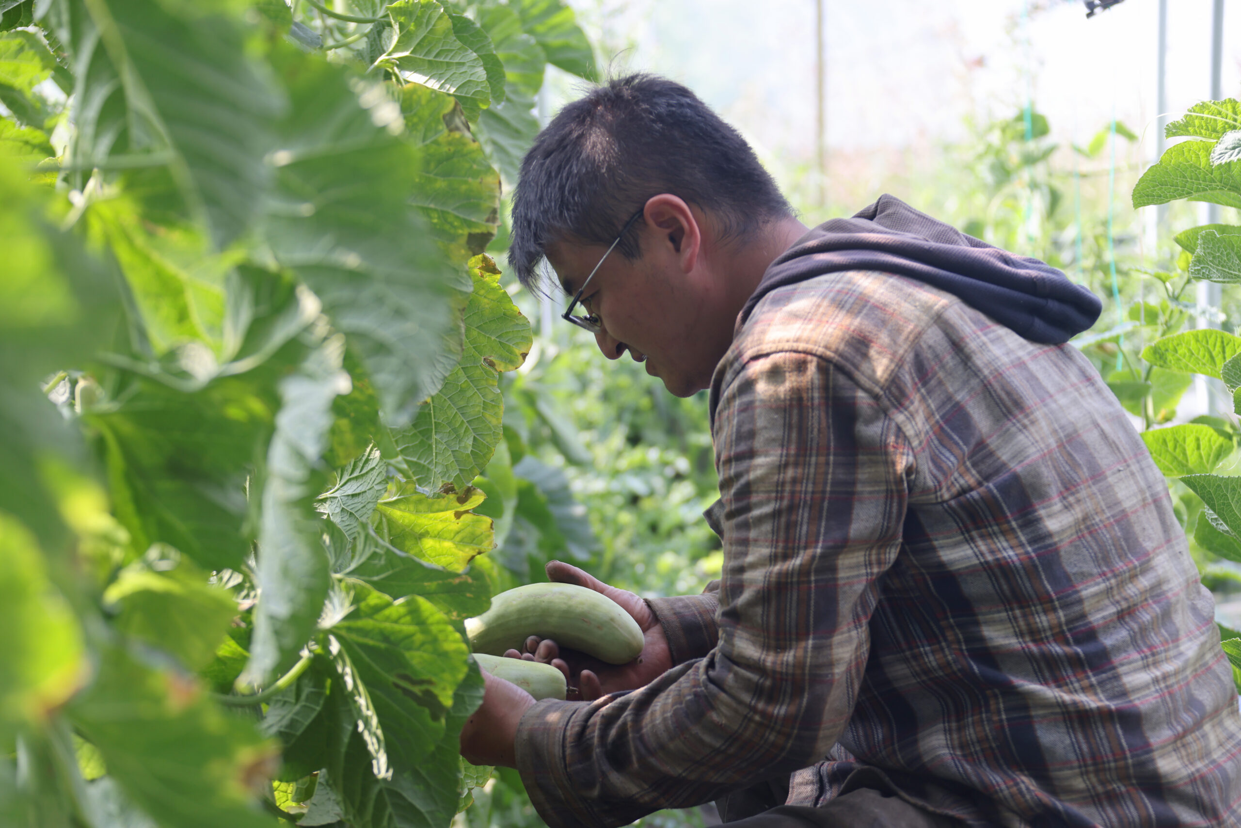 作为曾经的北京大学地质系“学霸”,董健毅移民加拿大后遭遇人生低谷,转型做了农民,却由此意外成为“网红”。网名“董菜菜”的他在接受中新社采访时讲述了自己艰辛创业5年多以来的心路历程。资料图为2022年7月10日,在加拿大阿尔伯塔省奥尔兹(Olds)小镇的“悠鲜美地”农场,“董菜菜”在自己搭建的第一座暖棚内采摘作物。