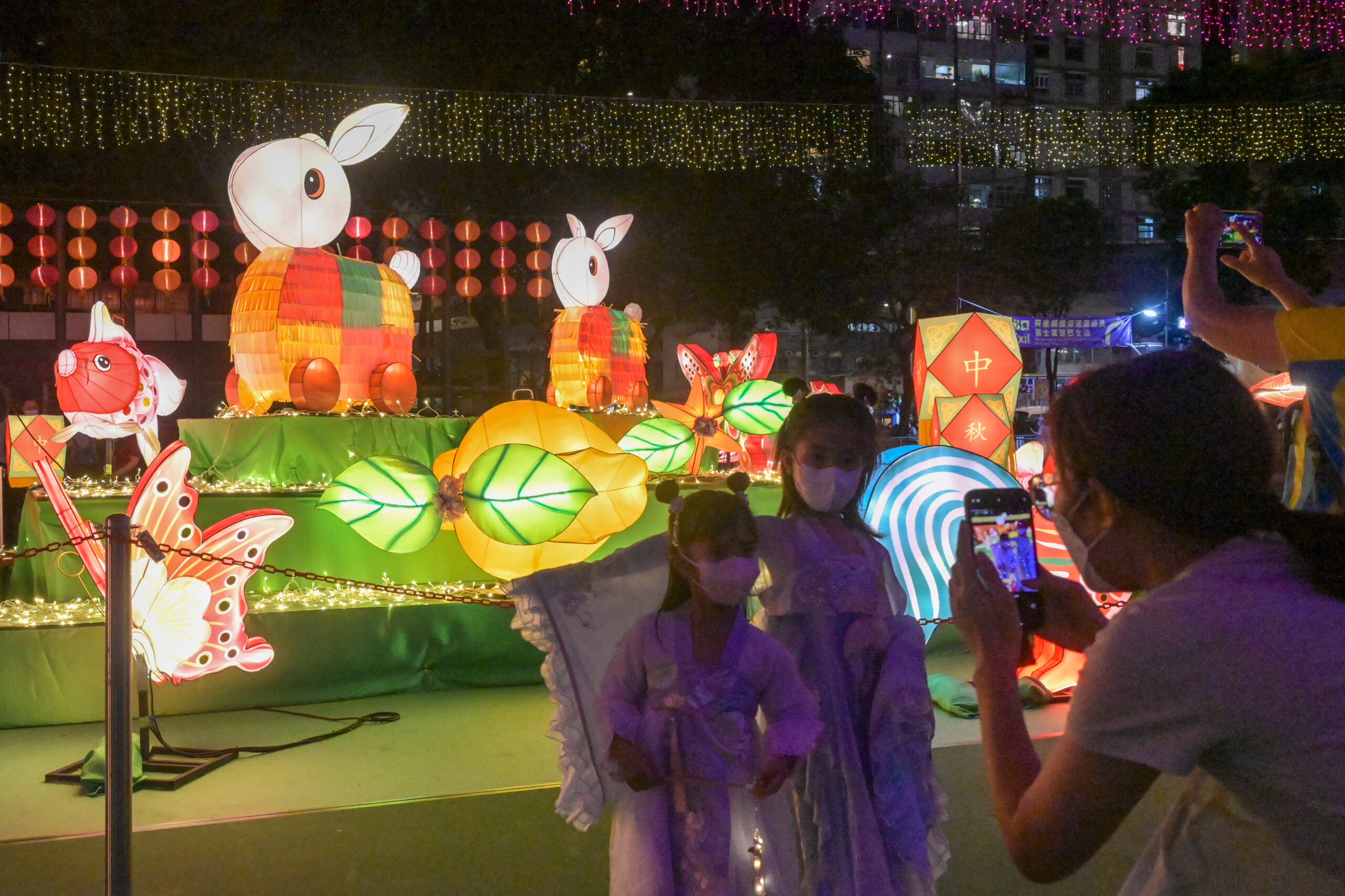 中秋节将至,9月8日,香港维多利亚公园足球场举行中秋彩灯展,彩灯作品包括《双星伴月庆团圆》中式帆船彩灯、12星座造型灯饰等,吸引众多市民到场观灯。图为家长为小朋友在中秋彩灯展展品前拍照。