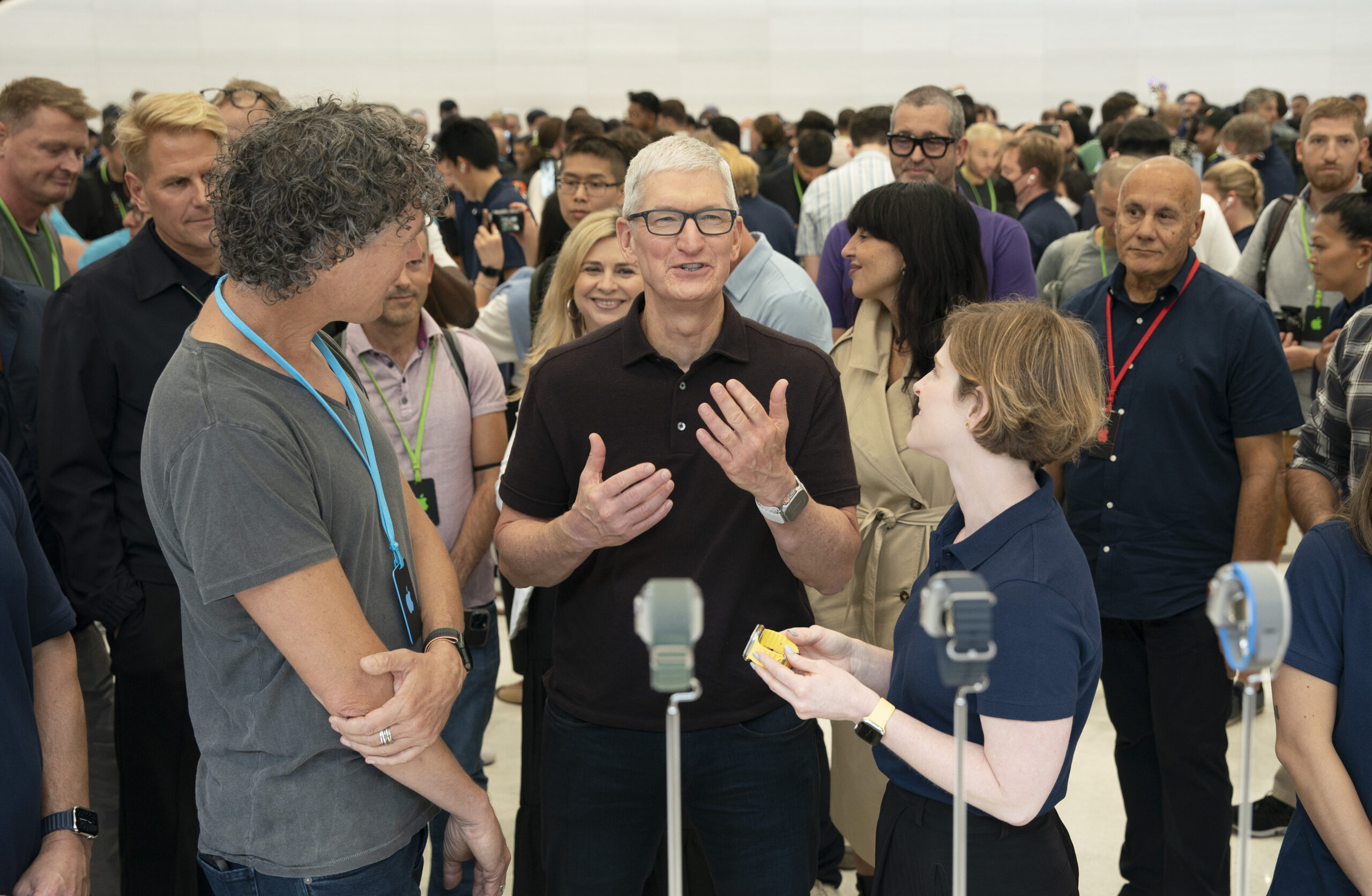 当地时间9月7日,美国苹果公司在加利福尼亚州丘珀蒂诺市苹果公司总部的乔布斯剧院举行新品发布会,推出新一代苹果手机、智能手表以及无线耳机。图为苹果公司首席执行官蒂姆·库克在乔布斯剧院参加新品展示活动。