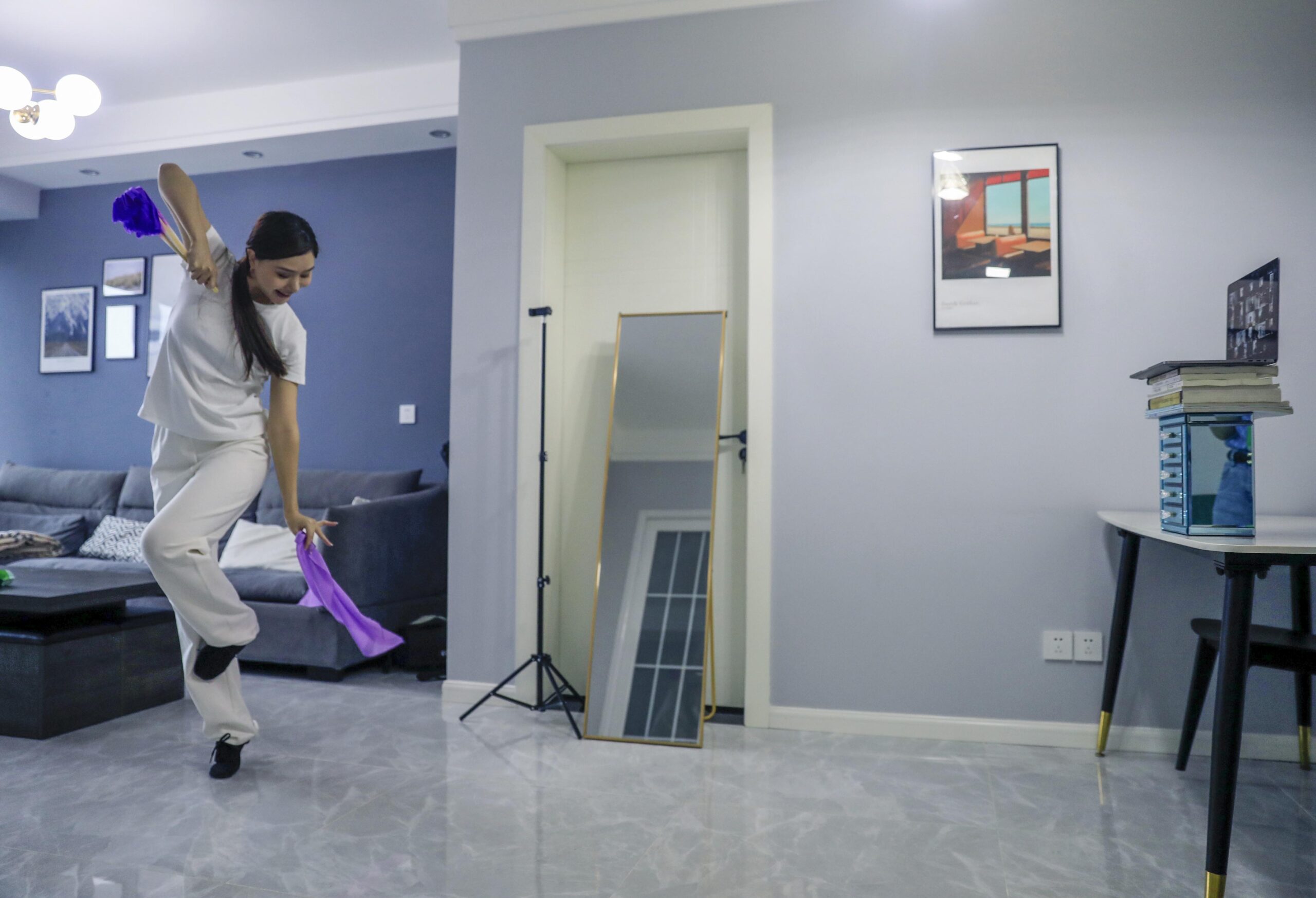 9月14日,四川成都,“90后”舞蹈老师黄雷苹在家中通过网络给学生做示范动作。连日来,四川师范大学舞蹈学院68名老师为941名学生开启了线上教学模式。1992年出生的舞蹈老师黄雷苹在家中通过网络远程指导、提前录制小视频等方式,让学生感受到其“身心合一”的表达,保证在线教学的质量。