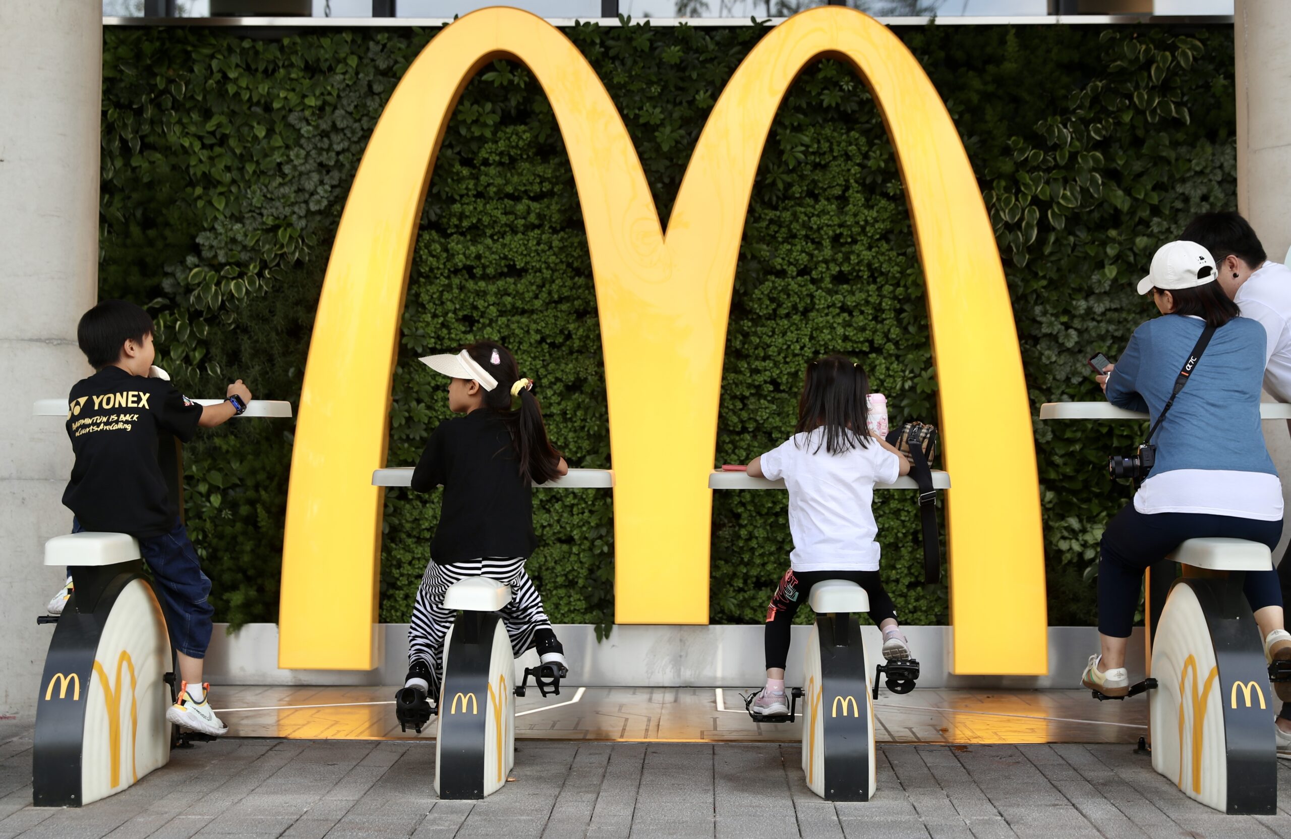 9月24日,记者探访北京麦当劳首钢园得来速餐厅,该餐厅按照国际权威绿色建筑认证LEED的零碳排放和零能耗标准设计和建造,通过超过2000平方米的场地内太阳能光伏发电系统,年发电量可达约33万度,满足餐厅日常运营电力需求,每年减少碳排放约200吨。图为消费者在体验环保充电单车,踩动单车可以为手机充电,还能点亮巨型麦当劳标志。