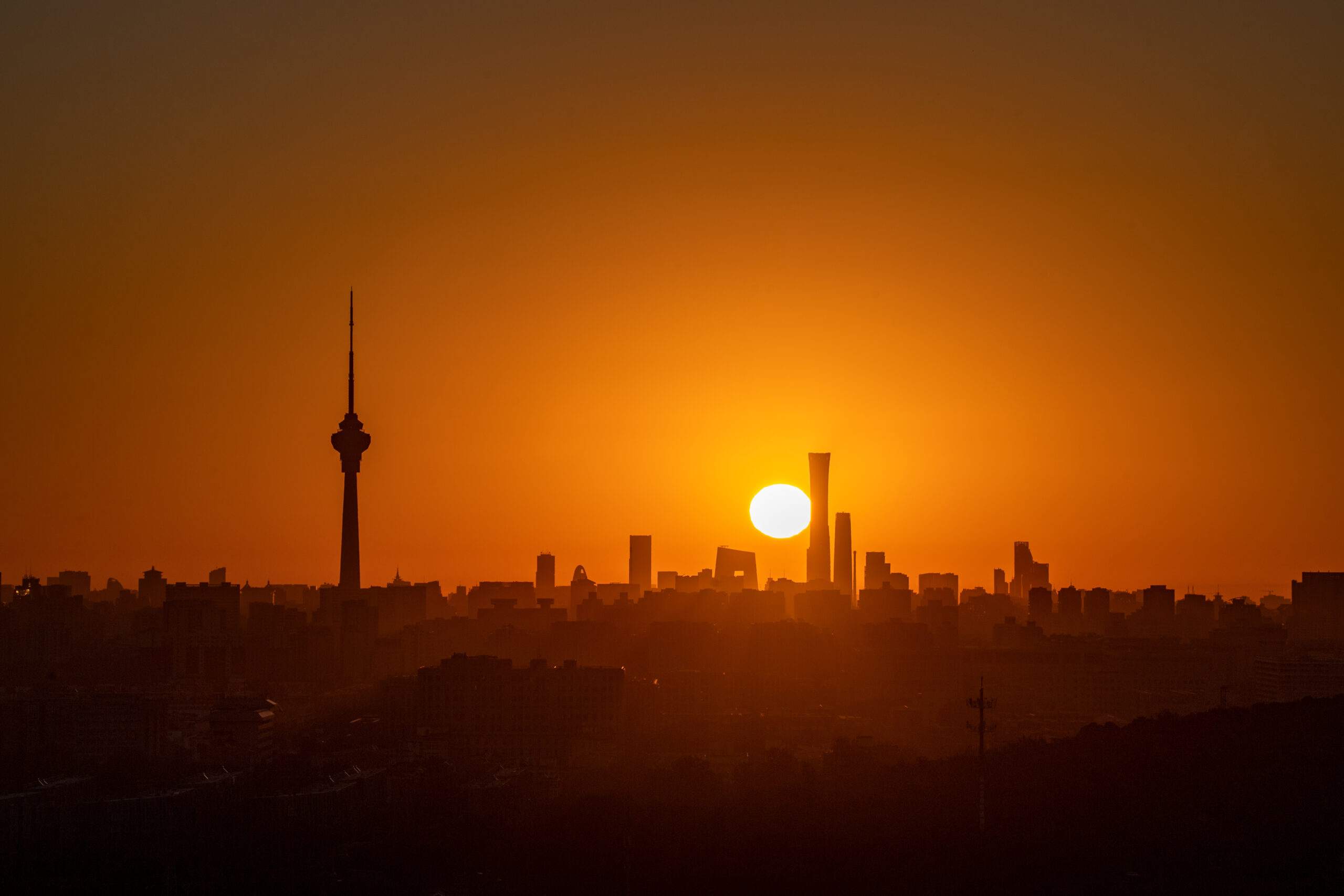 9月24日清晨,一轮红日从北京城市地平线上缓缓升起,城市剪影如画。