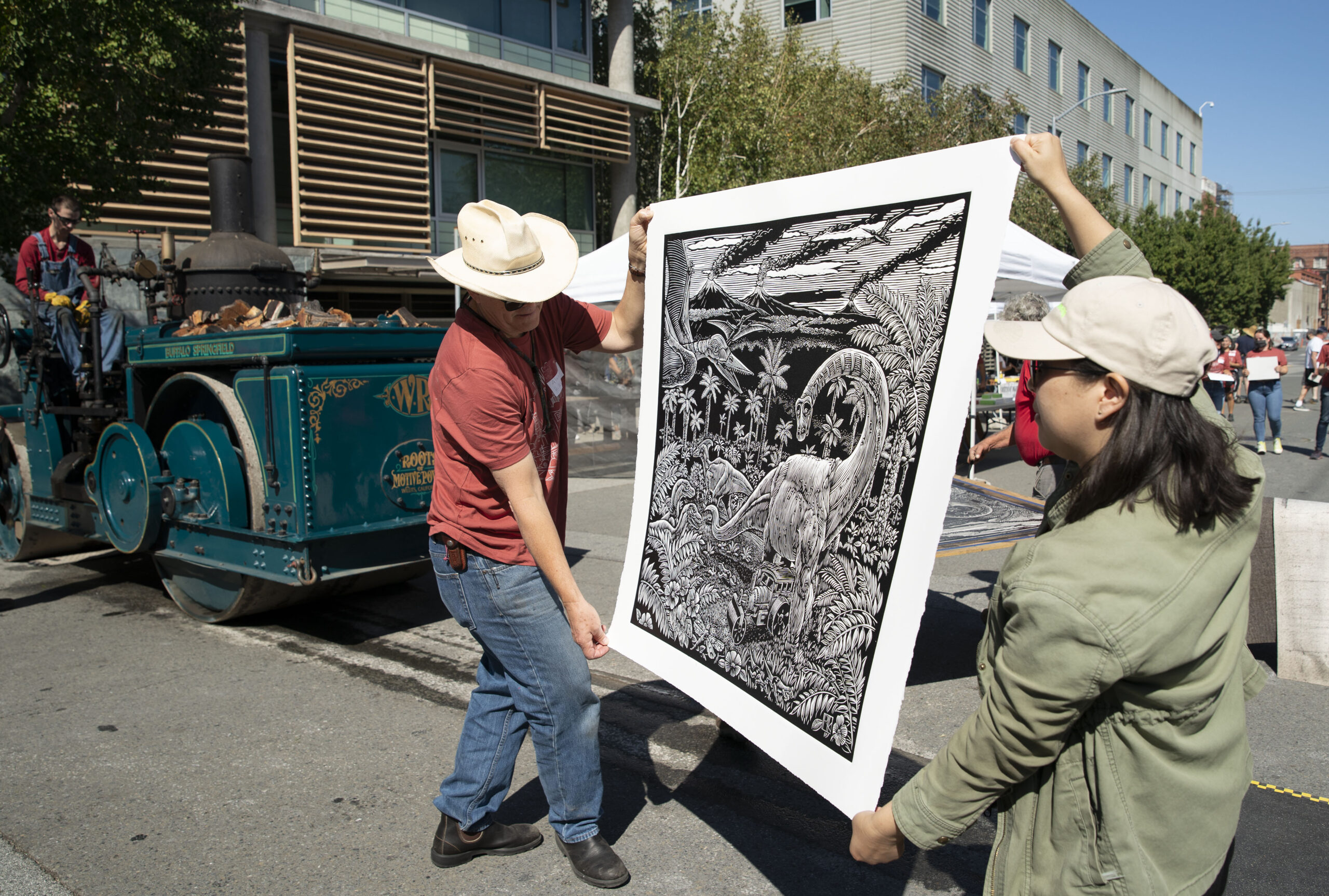 当地时间9月25日,由版画艺术家、印刷工人和压路机操作员组成的团队,用一辆重达7吨的1924款蒸汽压路机在美国加州旧金山街头压制版画。这是旧金山第19次举办该项活动,所得收入将惠及旧金山图书中心。