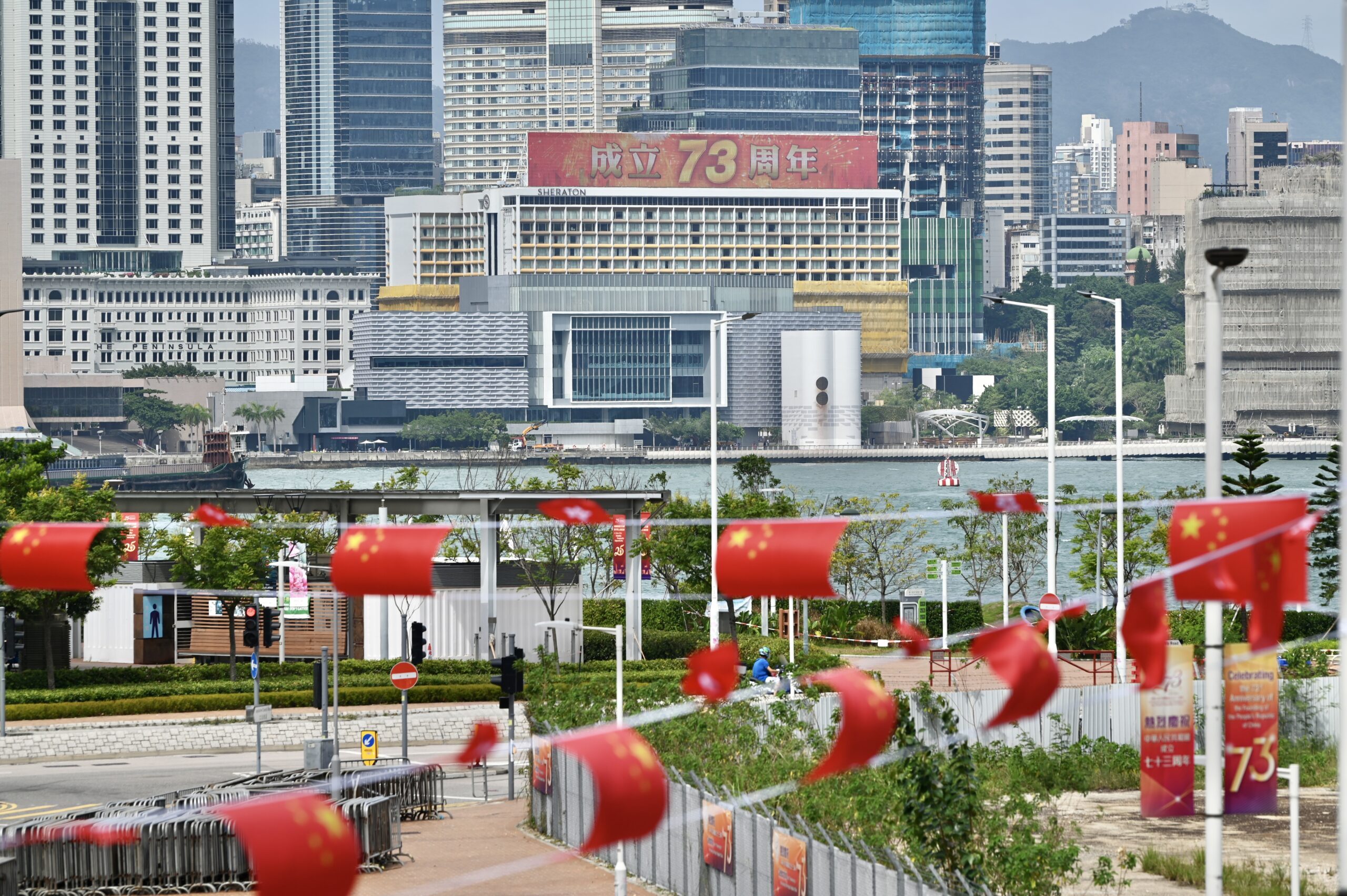 国庆节临近,9月27日,香港街头迎国庆气氛浓厚,特区政府总部外贴有巨幅国庆宣传画,天桥上挂满庆国庆的横幅,也有大厦外墙屏幕上显示庆国庆标语,旺角弥敦道的灯柱上挂满庆国庆彩旗。 未经允许不得转载:城市新闻网icitynews » 香港街头迎国庆气氛浓