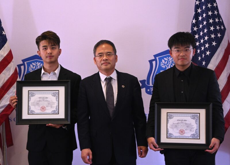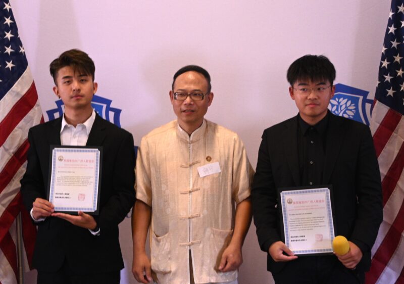 圣盖博市长丁言愉向第三屆美国留学生协会联盟成員颁发贺状
