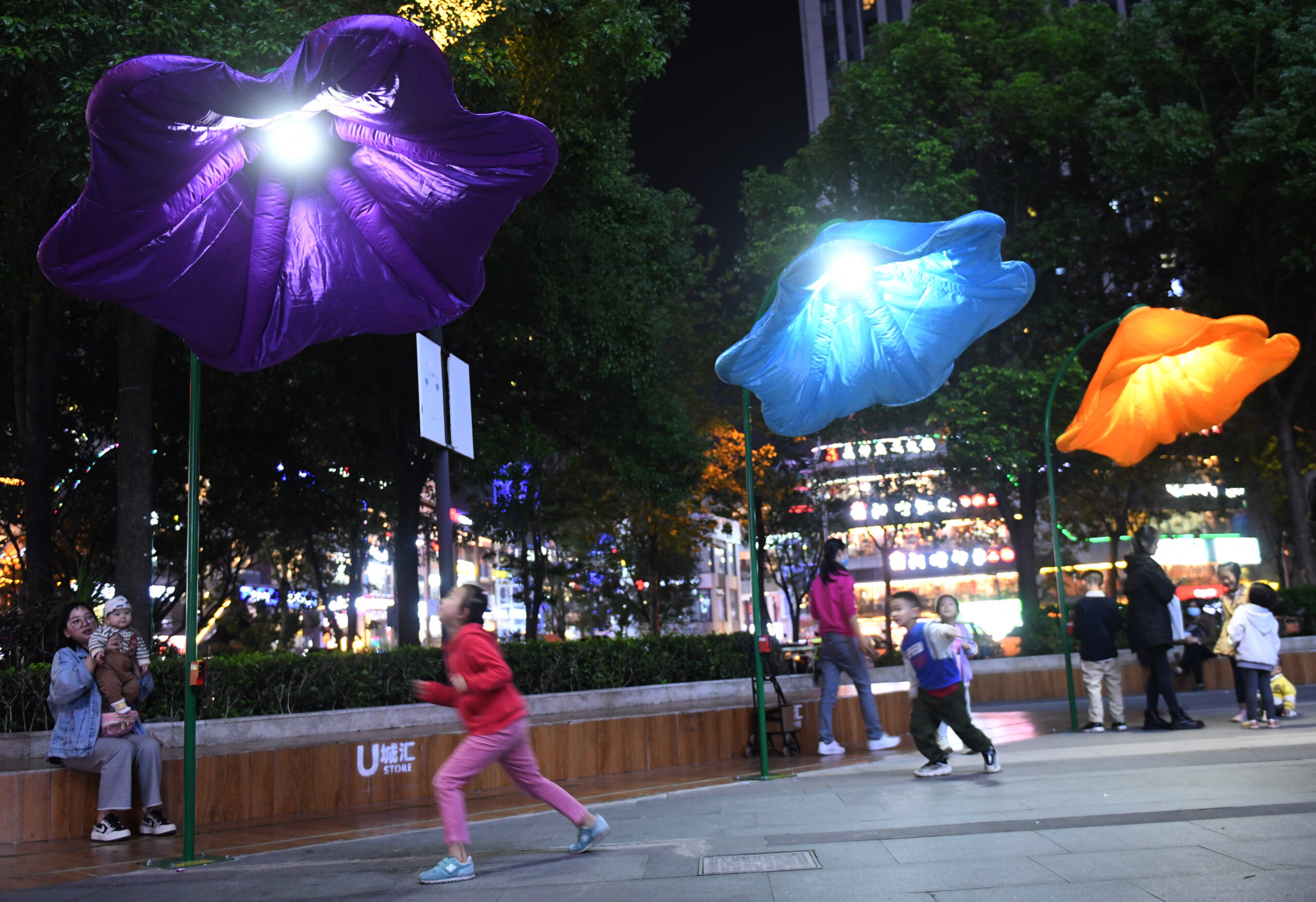 10月12日晚,重庆大学城附近一广场上的“开花路灯”吸引市民体验。这组“开花路灯”景观装置共三盏。当有人走到灯下,“花朵”会随之绽放并亮灯,当行人离开后,“花朵”缓缓收紧,灯光随之熄灭。