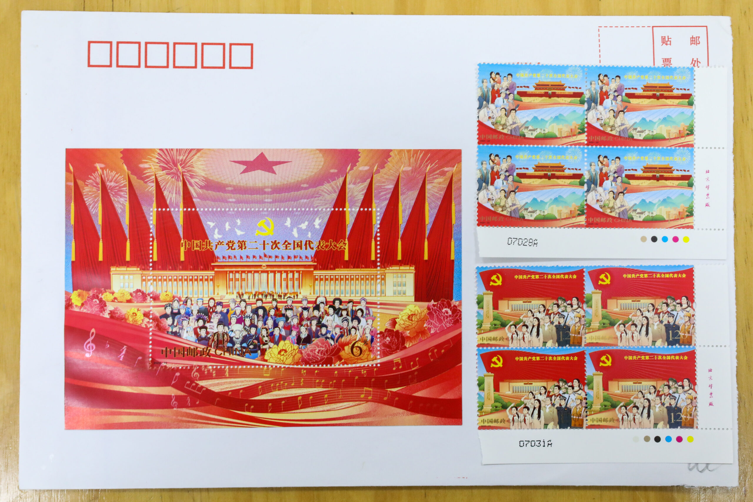10月16日,在贵州贵阳拍摄的《中国共产党第二十次全国代表大会》纪念邮票。当日,中国邮政发行《中国共产党第二十次全国代表大会》纪念邮票一套2枚,小型张1枚。