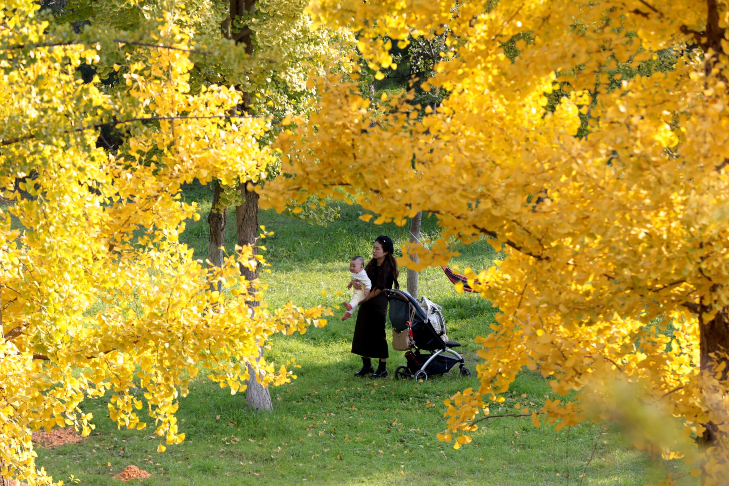 10月20日,陕西西安,市民带着宝宝漫步林间。秋意渐浓,位于西安市北郊河堤路两旁的绿化带也开始了“换装”,美景吸引了大量民众前往游玩。 未经允许不得转载:城市新闻网icitynews » 西安秋日风景如画