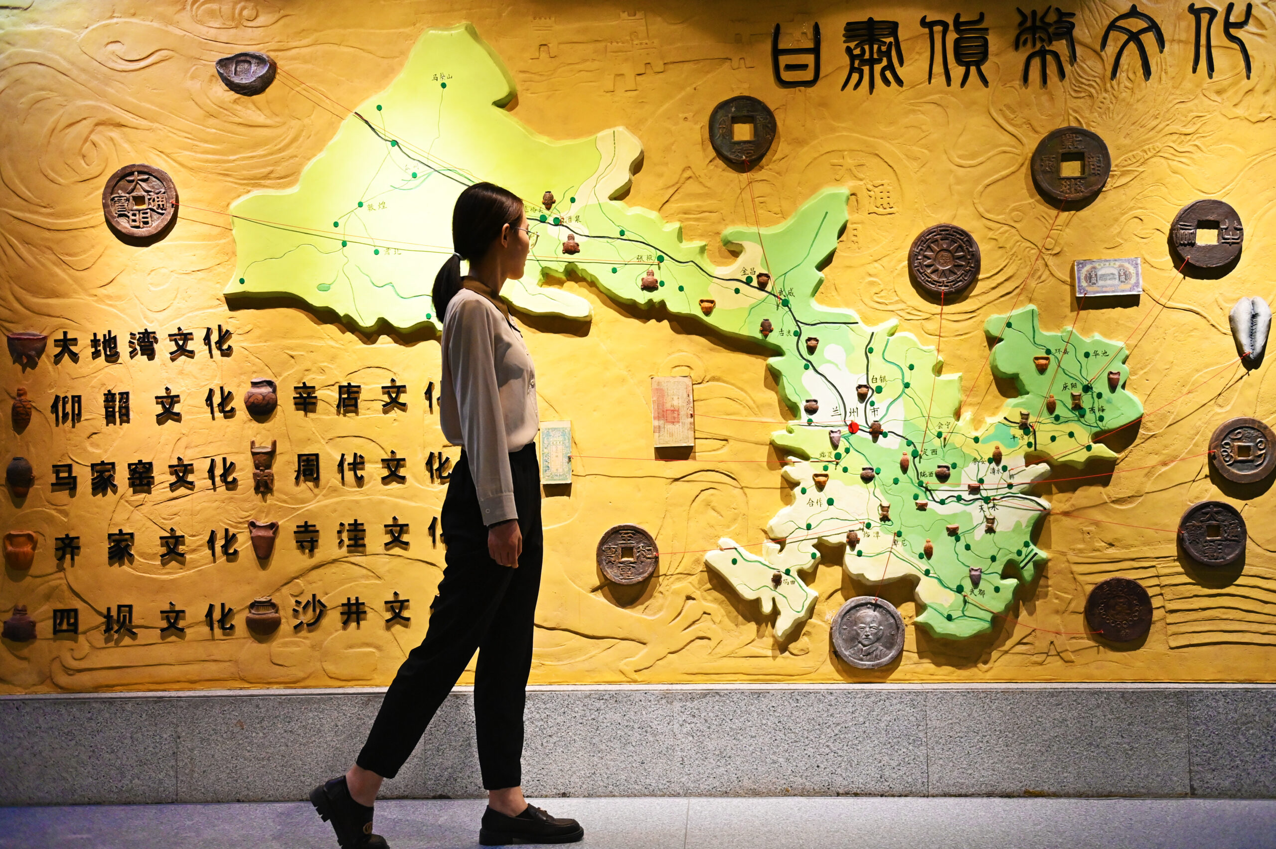 10月20日,在位于兰州市的甘肃钱币博物馆内,参观者走过“甘肃货币文化”展台。该系列货币反映了甘肃在土地革命时期至解放战争时期的货币历史。据了解,该馆收藏了古今中外钱币等文物近万件。