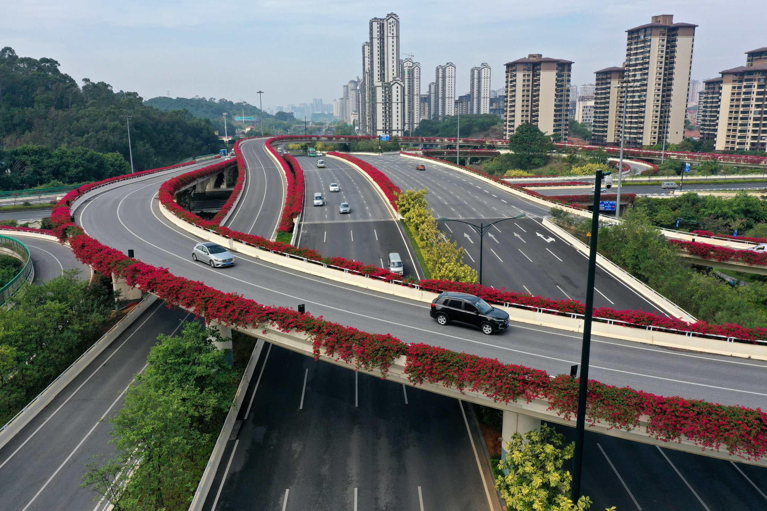 10月21日,航拍广西南宁市平象立交桥,绽放的三角梅装点车道两侧,来往车流穿行在红色“花廊”中。