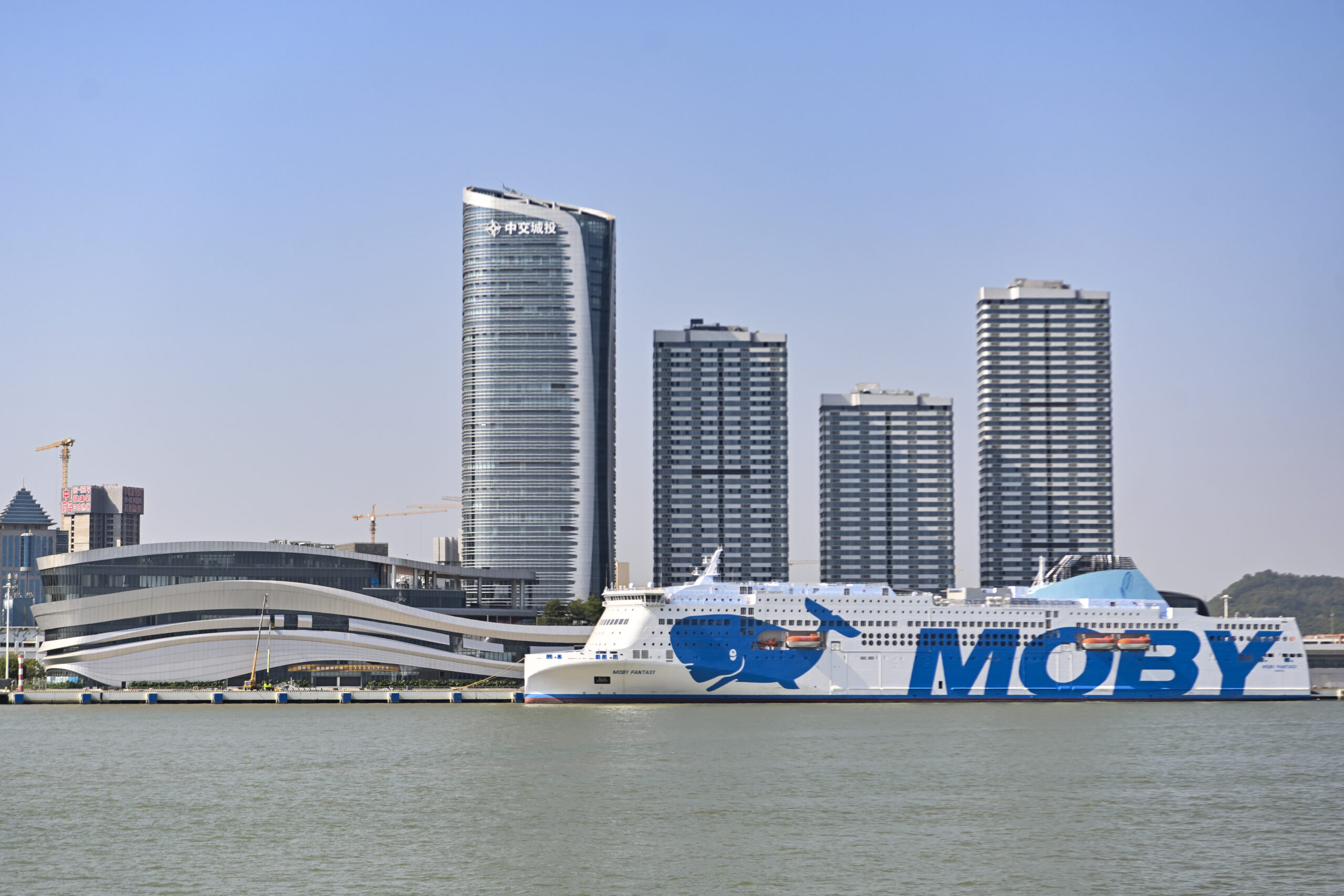 10月27日,广东省广州市,靠泊在南沙国际邮轮母港的豪华客滚船1号船。近日,中国船舶广船国际为意大利一家航运公司建造的2500客/3800米车道豪华客滚船1号船近日在广州装修完成,以试航形式靠泊在南沙国际邮轮母港内。该船共有13层甲板,533间舱室,5层车库,总吨位达7万吨,为全球最大吨位的客滚船。