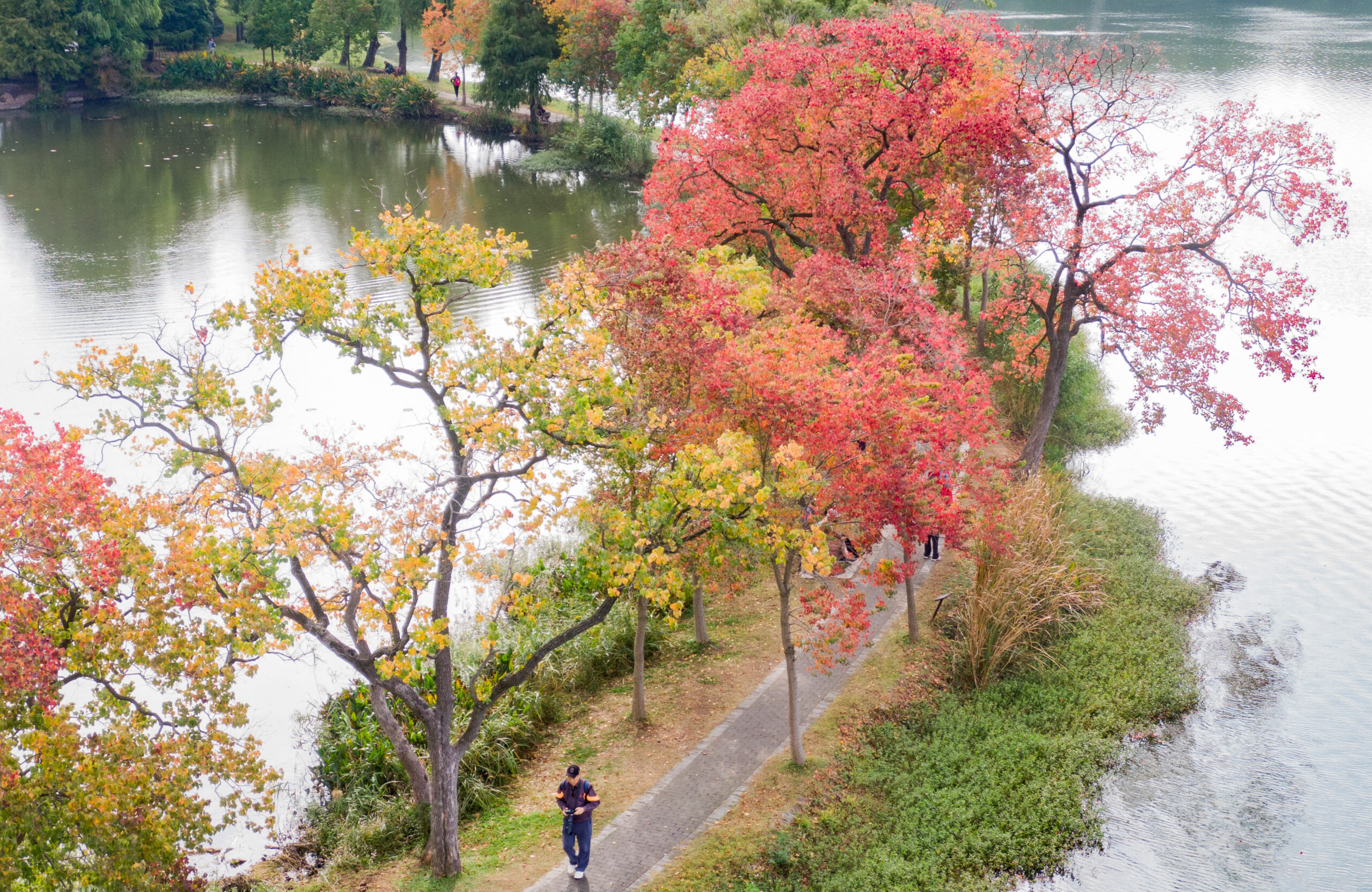10月28日,航拍南京紫金山前湖段,色彩斑斓的“月牙堤”、静谧的湖水,呈现浓浓秋意。