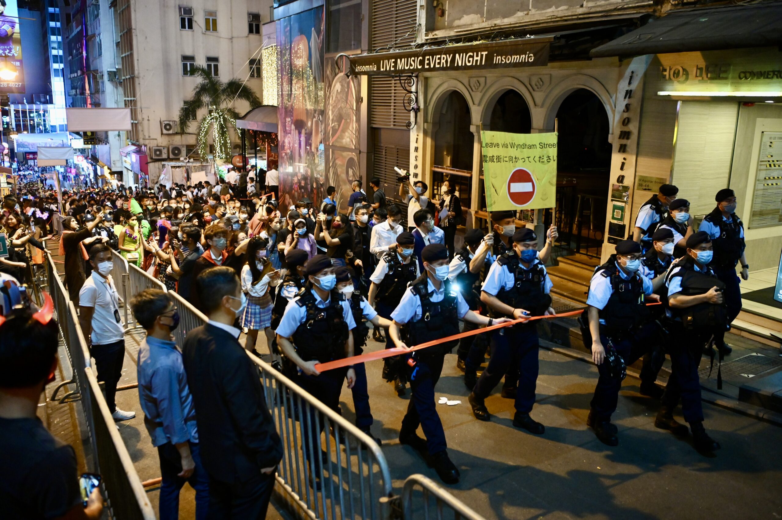 10月31日晚上,众多香港市民到中环兰桂坊庆祝万圣节,警方实施人流管制,呼吁市民切勿停留。图为警方实施人流管制。 未经允许不得转载:城市新闻网icitynews » 香港市民于兰桂坊庆祝万圣节 警方实施人流管制