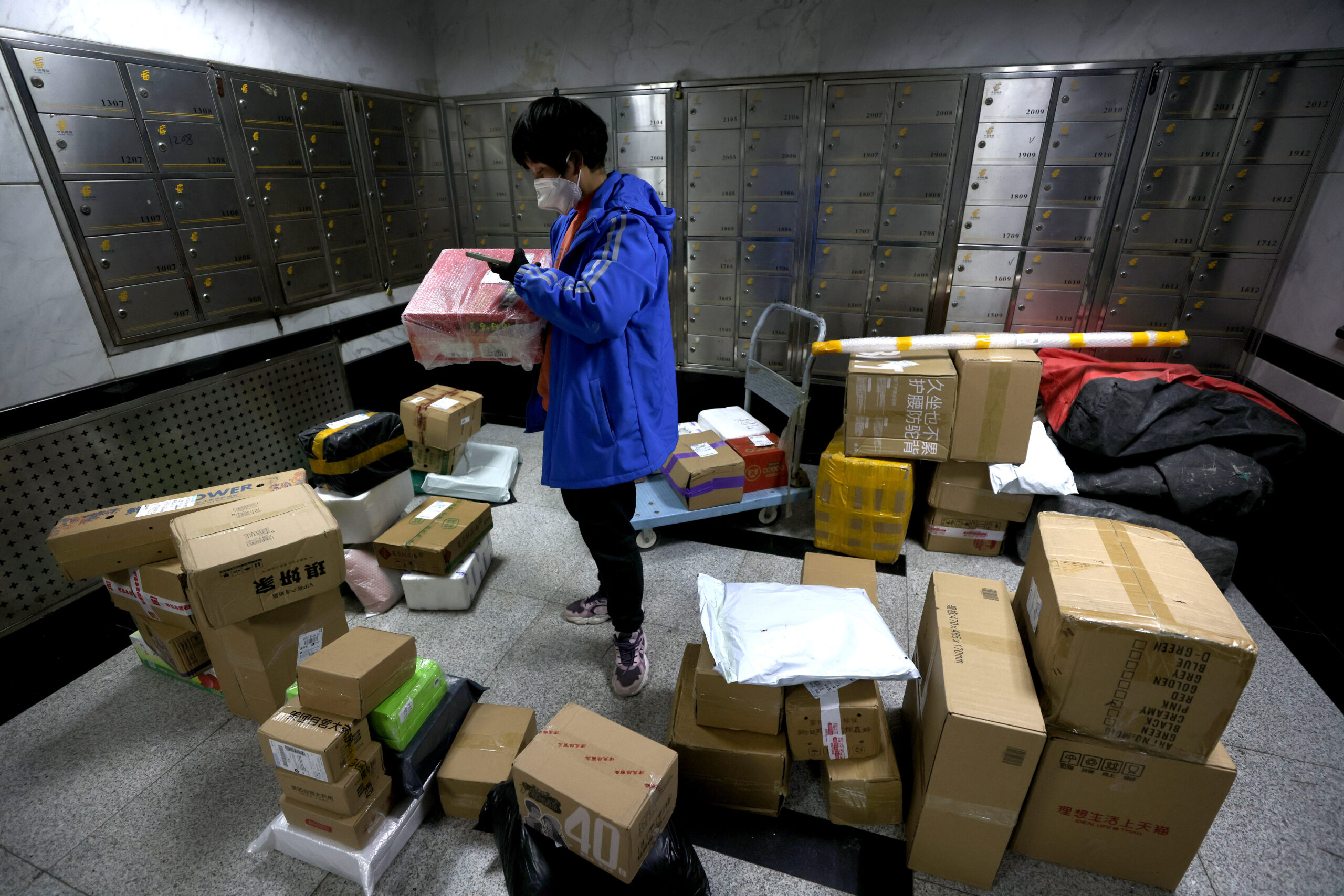 11月8日,北京丰台区,中通女快递员郭巧飞在住宅楼中分拣快递,准备派送。“双十一”购物节将至,物流派件渐迎高峰。