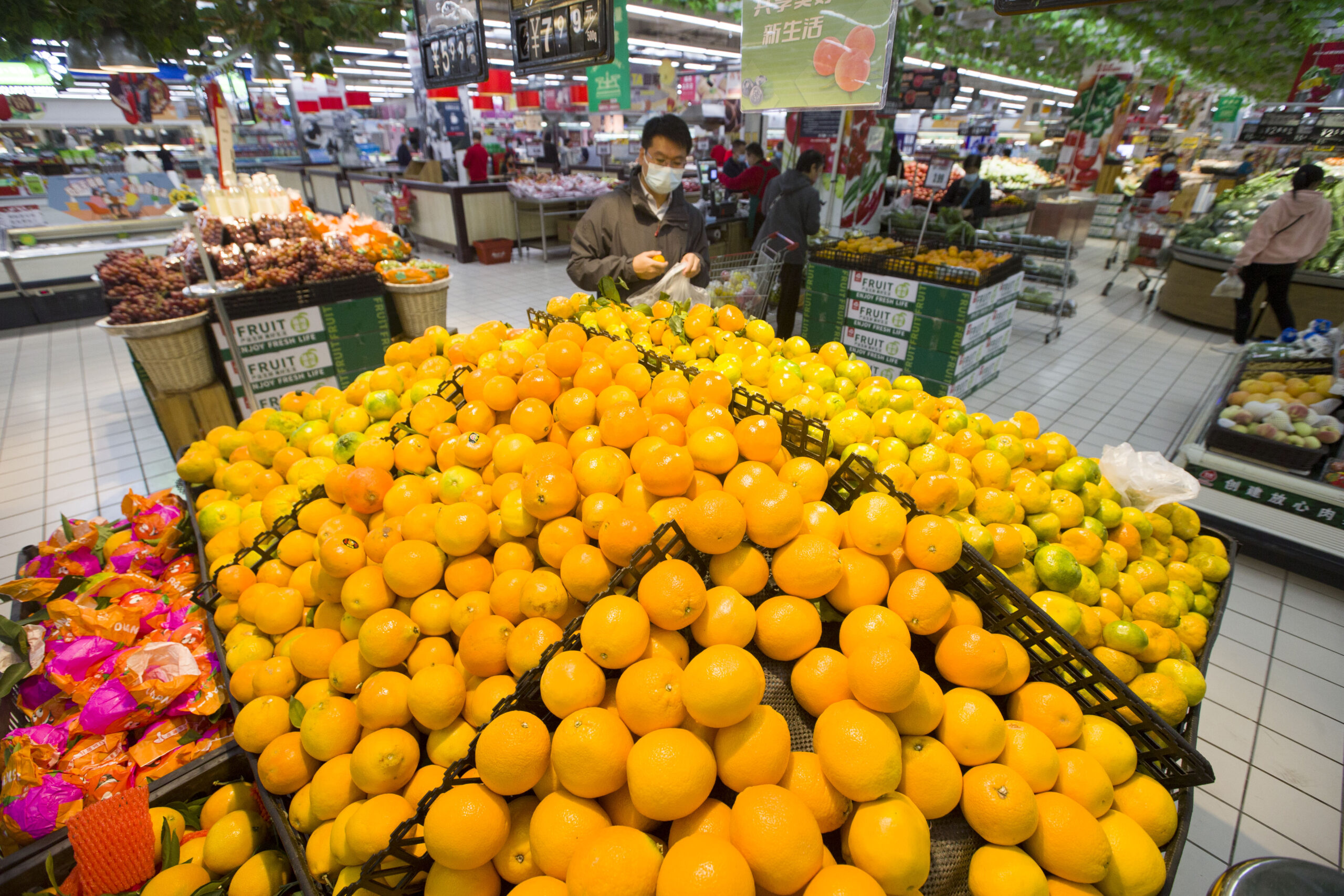 11月15日,中国国家统计局公布的数据显示,10月,中国社会消费品零售总额40271亿元人民币,同比下降0.5%,连续两个月增速回落。资料图为山西太原,消费者在超市选购果蔬。
