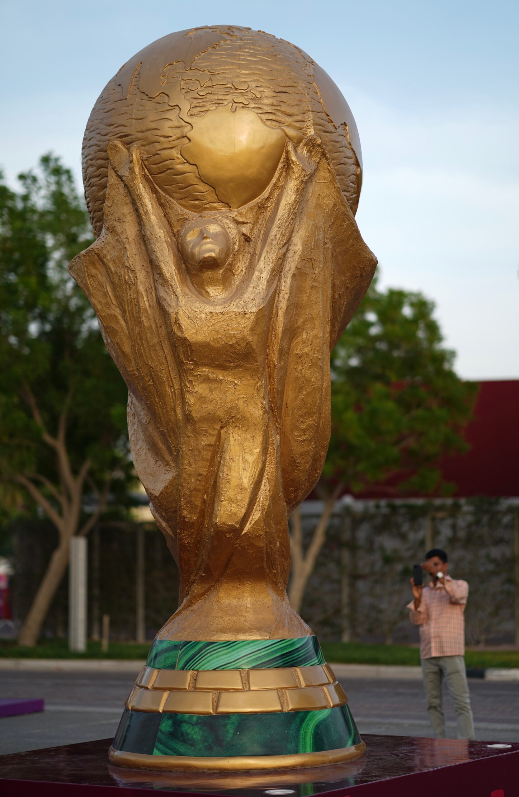 当地时间11月17日,卡塔尔多哈,哈里发国际体育场外的大力神杯雕塑。
