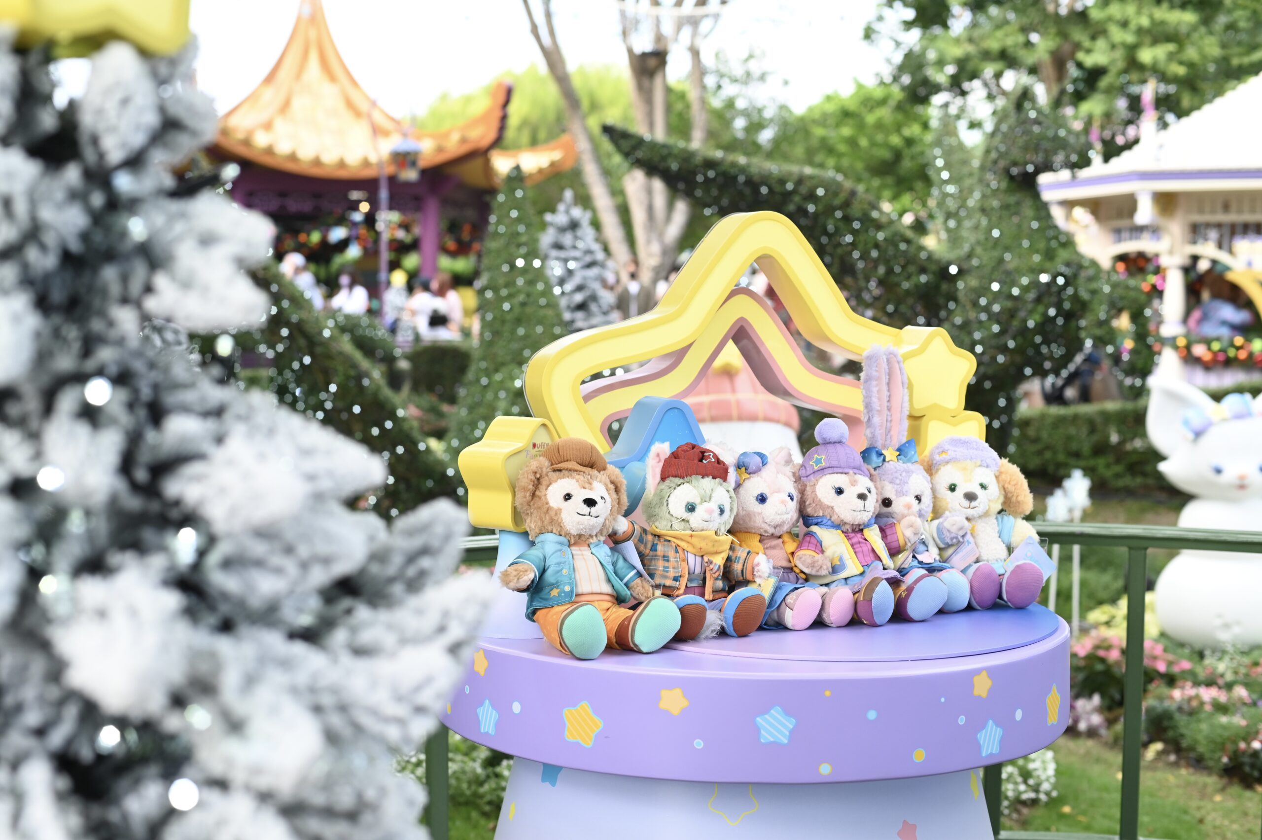 11月18日,香港迪士尼乐园度假区即日起举办圣诞活动,奇妙梦想城堡舞台的圣诞舞会,巨型圣诞树亮灯及飘雪效果迎接宾客。图为“Duffy与好友冬日花园”内的圣诞装饰。