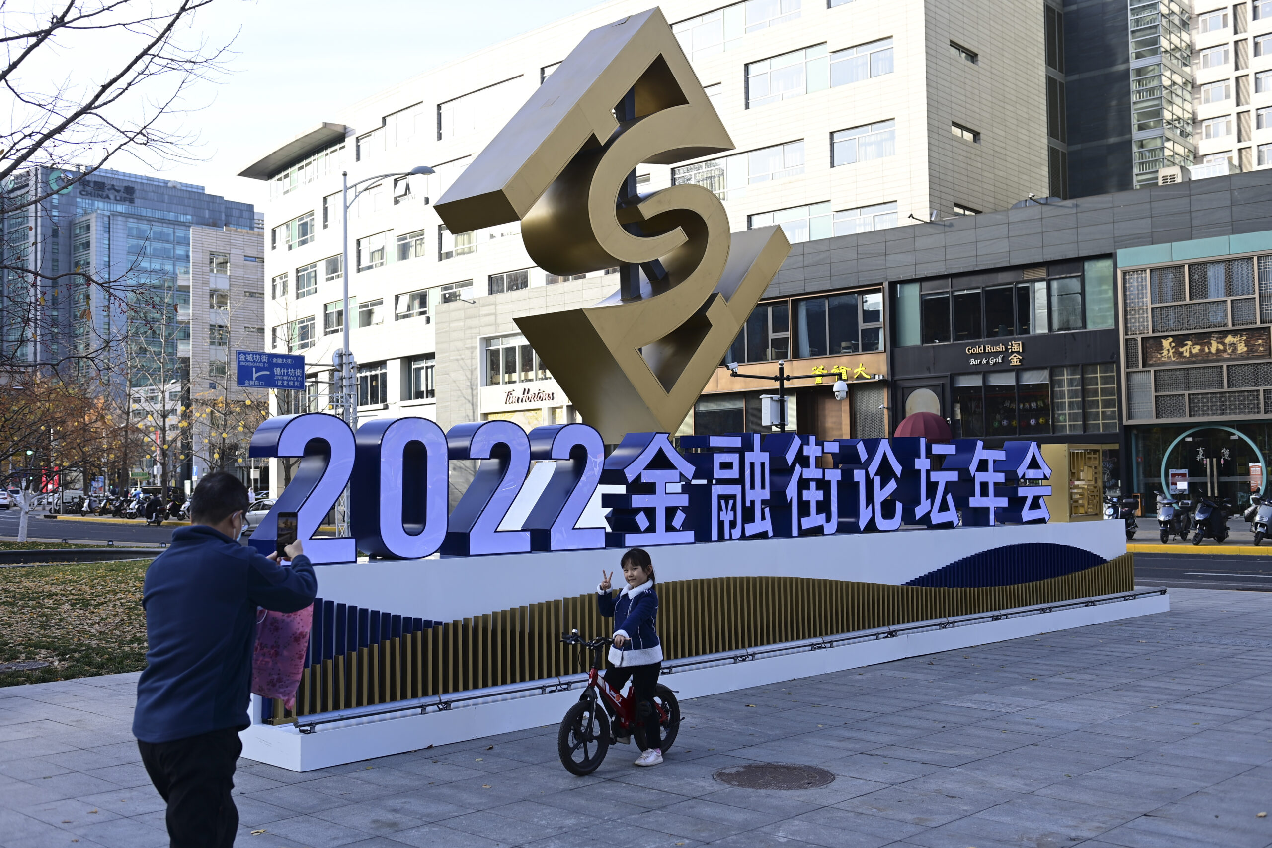 11月21日,北京,市民在2022金融街论坛年会主题装置前拍照留念。当日,2022金融街论坛年会在北京开幕,本届论坛年会主题为:“踔厉奋发,共向未来——变局下的经济发展与金融合作”。