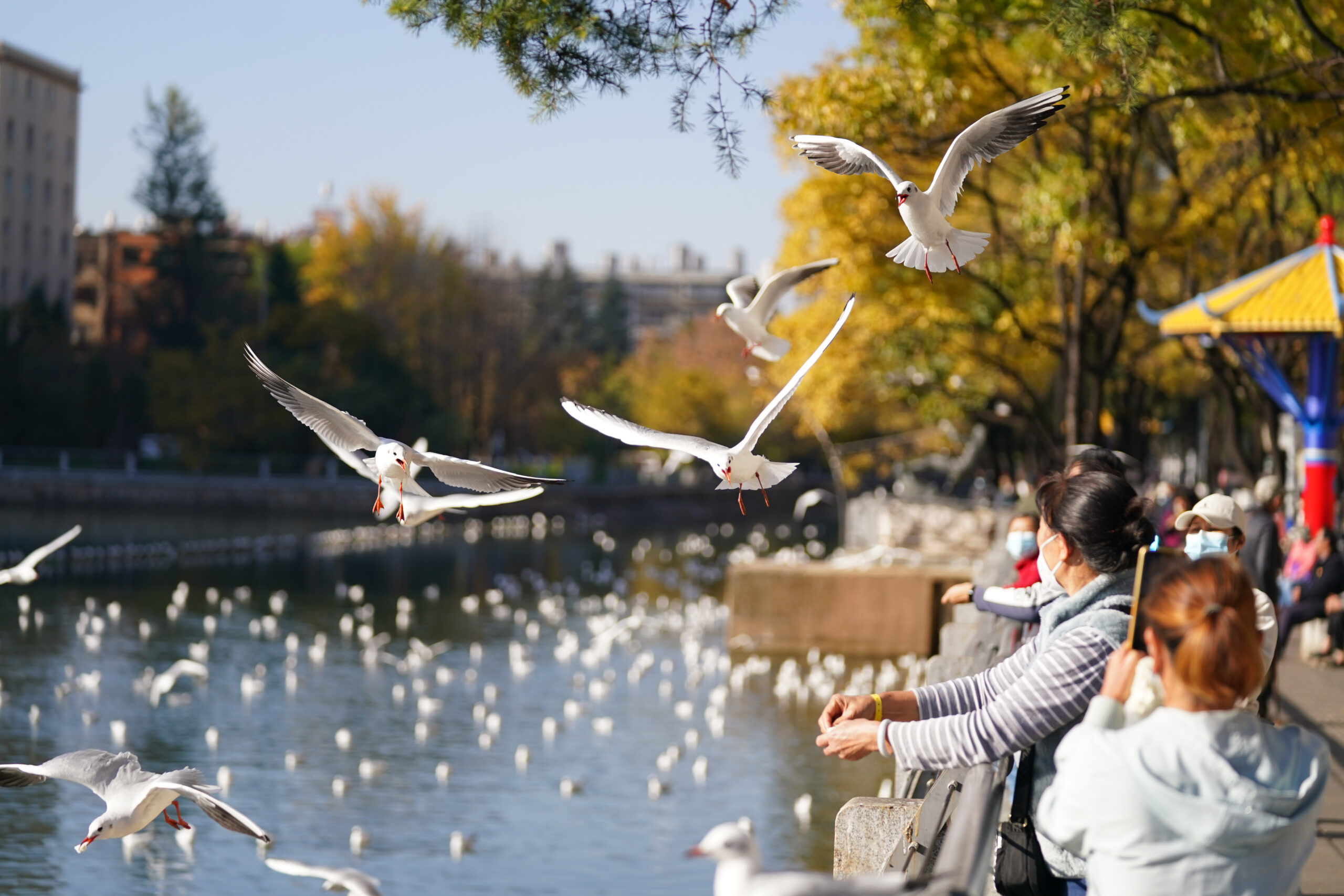 11月22日,云南昆明,市民在大观河投喂红嘴鸥。当日是二十四节气中的小雪,昆明依旧阳光明媚,温暖宜人,不少市民来到大观河边,和越冬红嘴鸥共度初冬时的美好时光。