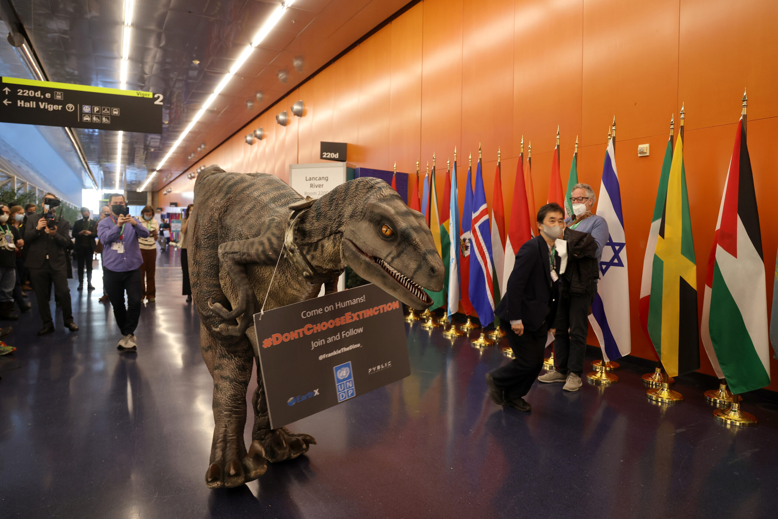 当地时间12月12日,加拿大蒙特利尔,在联合国开发计划署策划的一场活动中,名为弗兰基(Frankie)的仿真恐龙“闯入”《生物多样性公约》第十五次缔约方大会(COP15)第二阶段会议会场,以宣传应对气候变化与生物多样性丧失危机、拯救自然的理念。