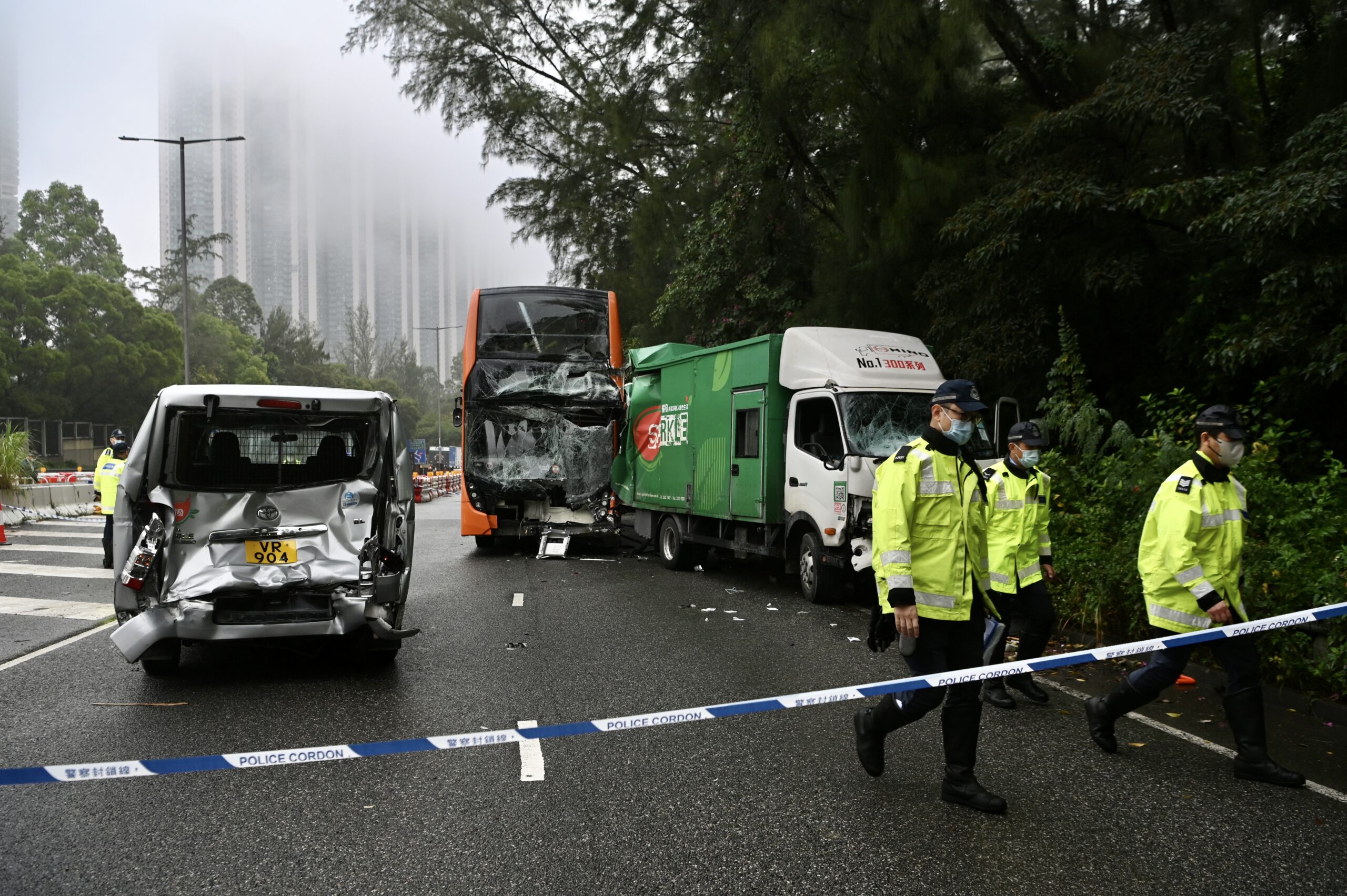12月16日上午9时18分,香港东涌发生一起致命交通事故,一辆巴士、一辆货车及一辆轻型货车于东涌东交汇处相撞。据了解,事故中2人死亡,10人受伤,警方及消防救护人员于现场调查及处理事故。图为警方人员调查事故。
