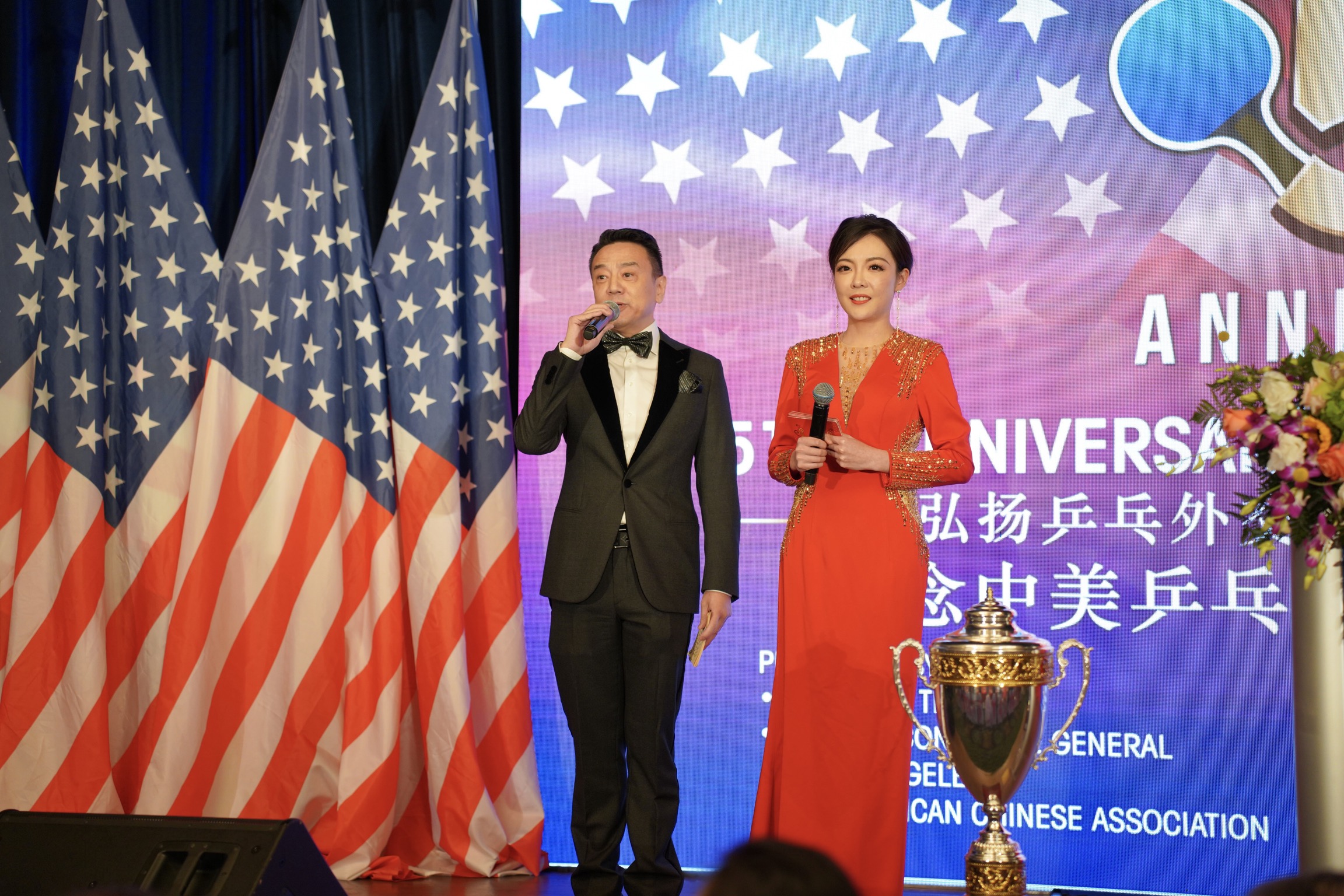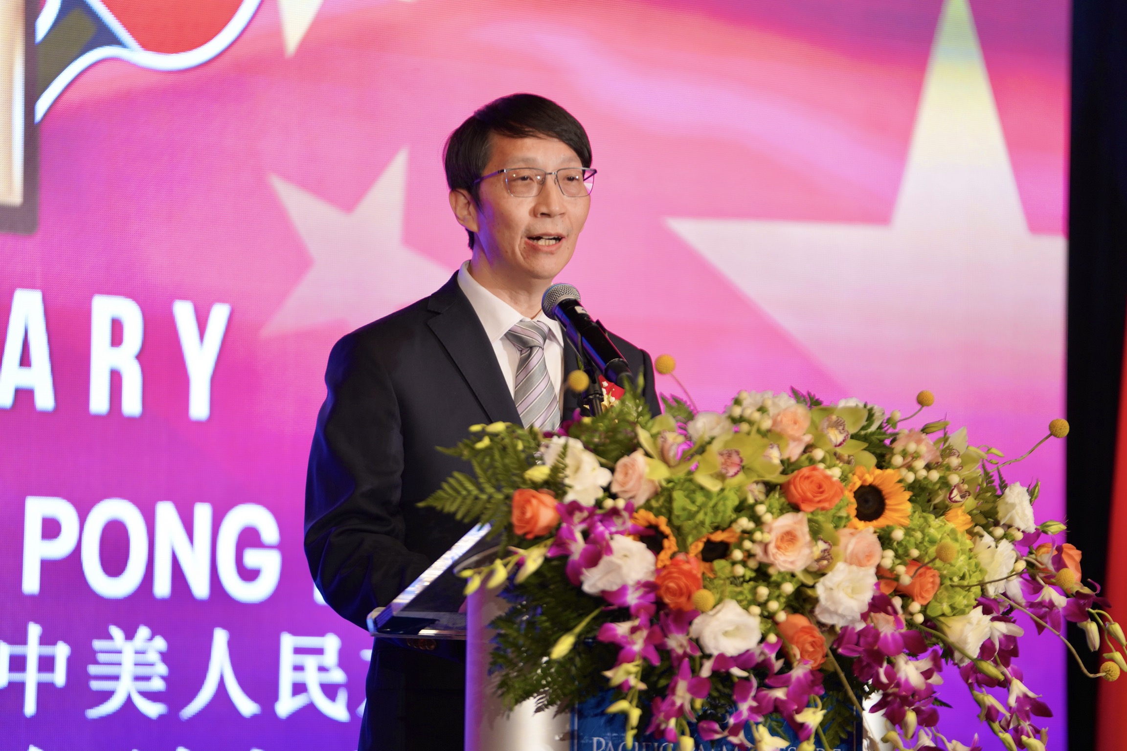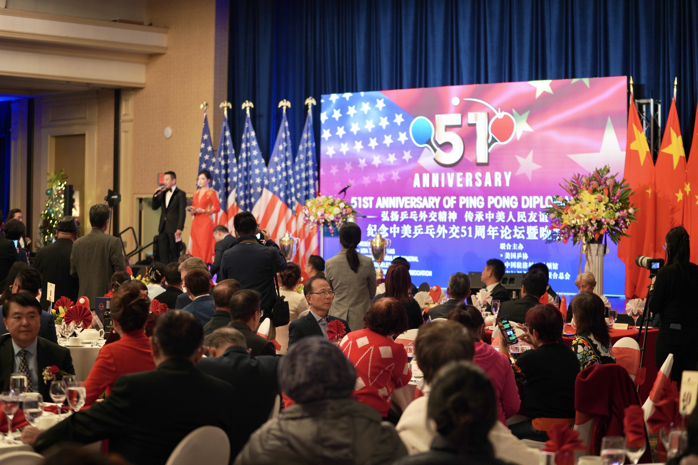 日前,由美国乒协、中国驻洛杉矶总领事馆、美国南加州华人华侨联合总会联合主办的纪念中美乒乓外交51周年论坛暨晚宴于洛杉矶盛大举行。驻洛杉矶总领事张平、副总领事李春林、美国乒协主席 Richard Char、CEO 沈伟妮、美国南加州华人华侨联合总会会长蔡成华、美国奥委会主席 Gene Sykes、国际乒联主席 Petra Sorling出席活动,美中关系全国委员会副主席 Jan Berris,通过视频献上祝福。加州众议员方树强、美国国会众议员赵美心的代表,前加州众议员伍国庆现场并颁发贺状。