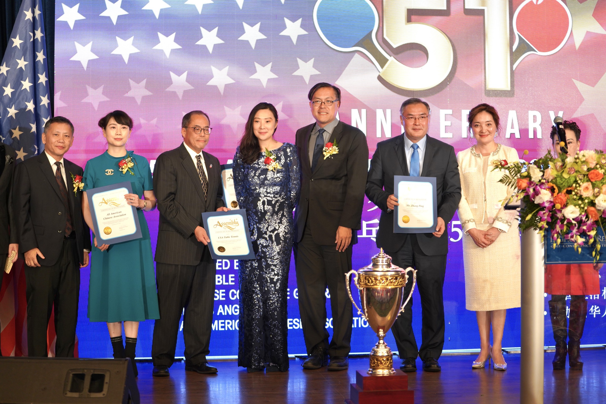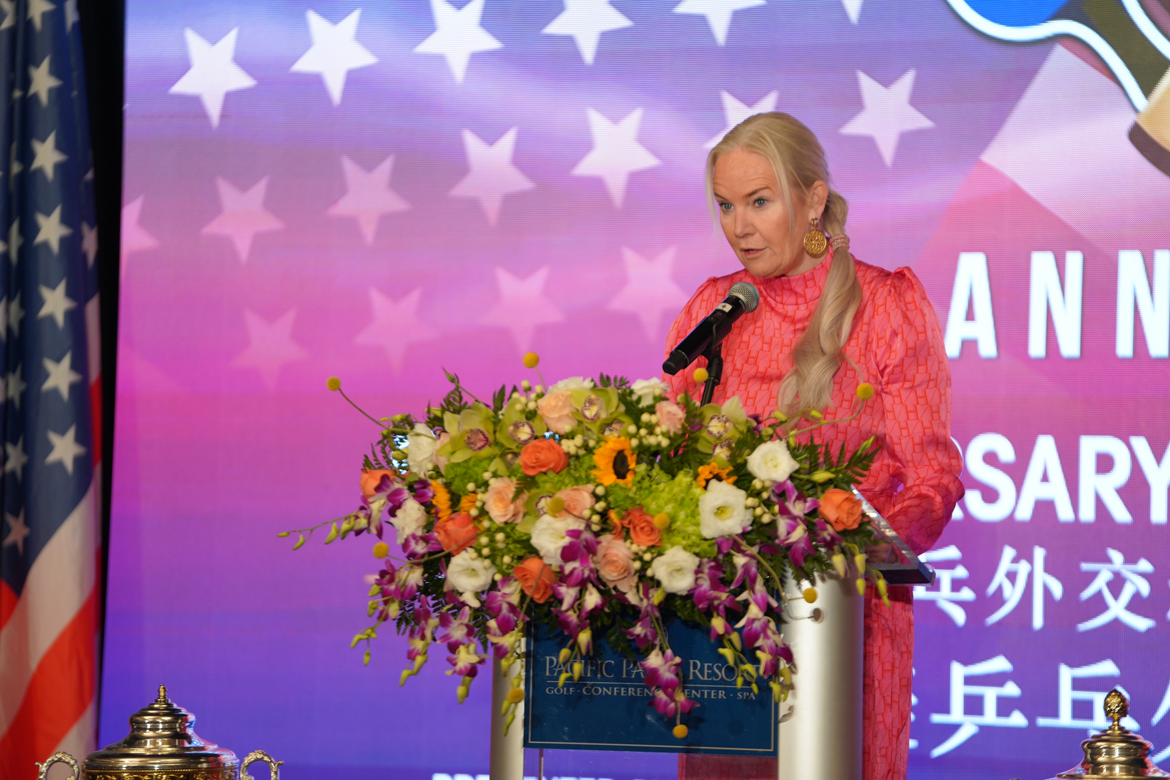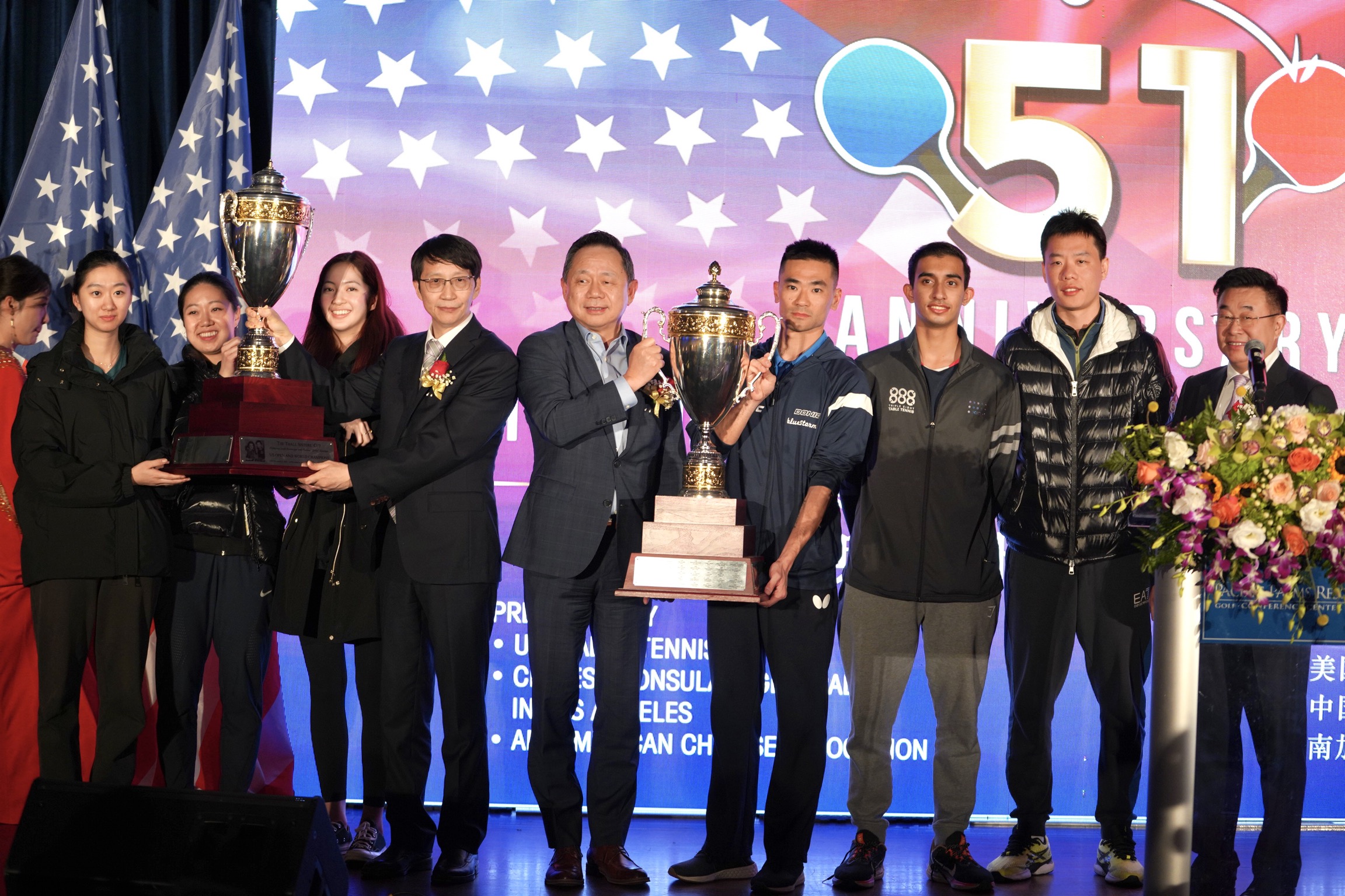 日前,由美国乒协、中国驻洛杉矶总领事馆、美国南加州华人华侨联合总会联合主办的纪念中美乒乓外交51周年论坛暨晚宴于洛杉矶盛大举行。驻洛杉矶总领事张平、副总领事李春林、美国乒协主席 Richard Char、CEO 沈伟妮、美国南加州华人华侨联合总会会长蔡成华、美国奥委会主席 Gene Sykes、国际乒联主席 Petra Sorling出席活动,美中关系全国委员会副主席 Jan Berris,通过视频献上祝福。加州众议员方树强、美国国会众议员赵美心的代表,前加州众议员伍国庆现场并颁发贺状。