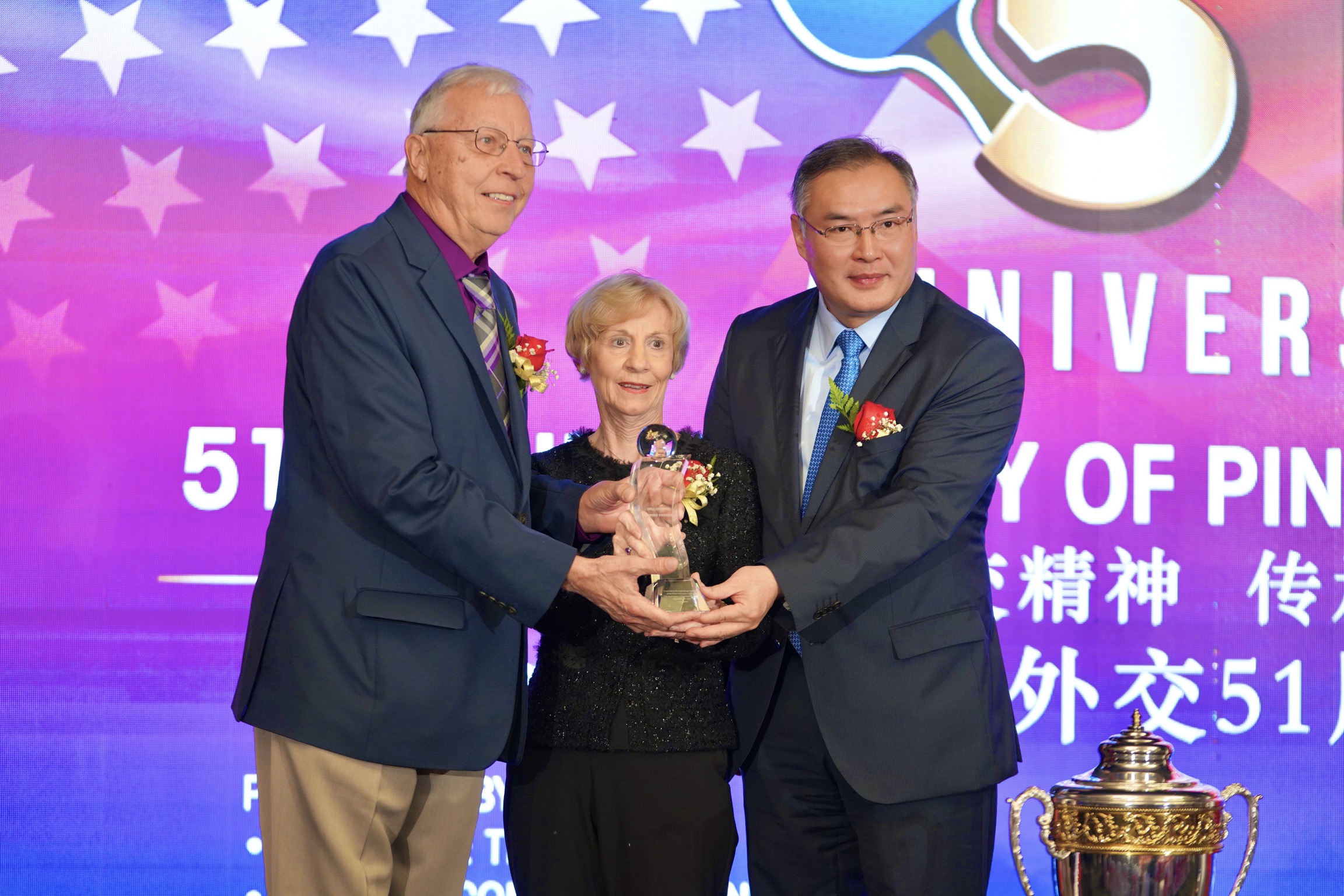驻洛杉矶总领事张平向50年前访问中国的前美国国家乒乓球队队员夫妇,Dell Sweeris及夫人Connie Sweeris颁奖