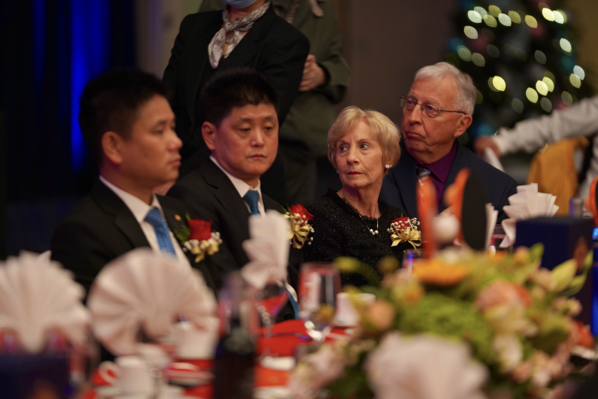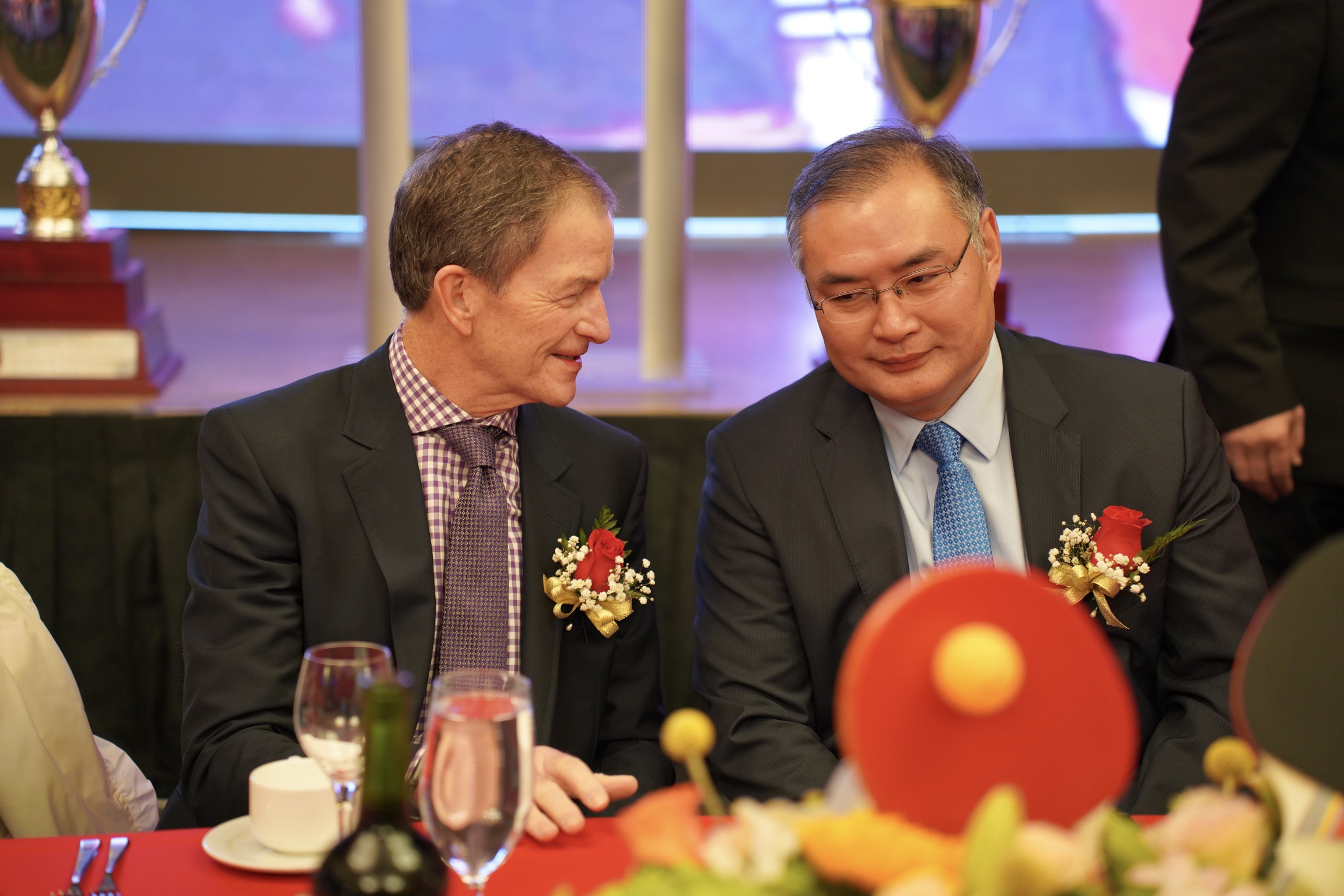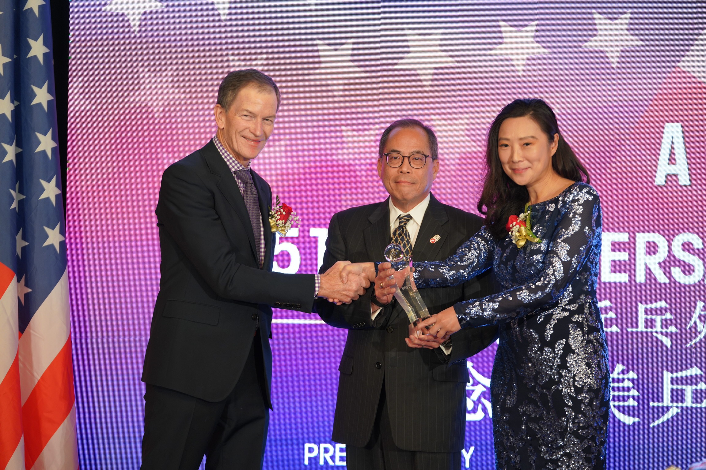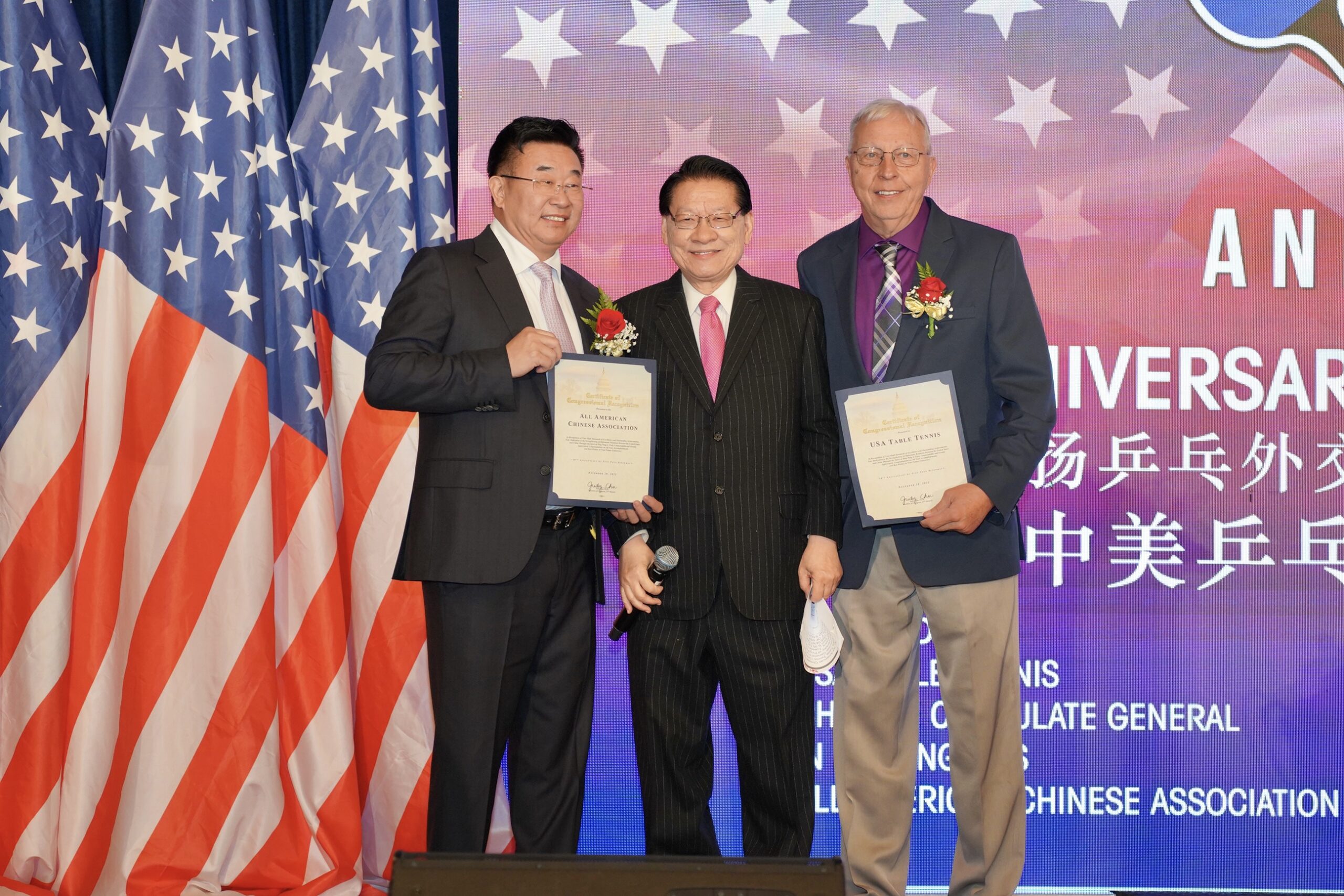 美国奥委会主席 Gene Sykes,向美国乒协主席 Richard Char和CEO 沈伟妮(Virginia Sung)颁发了乒乓外交贡献奖