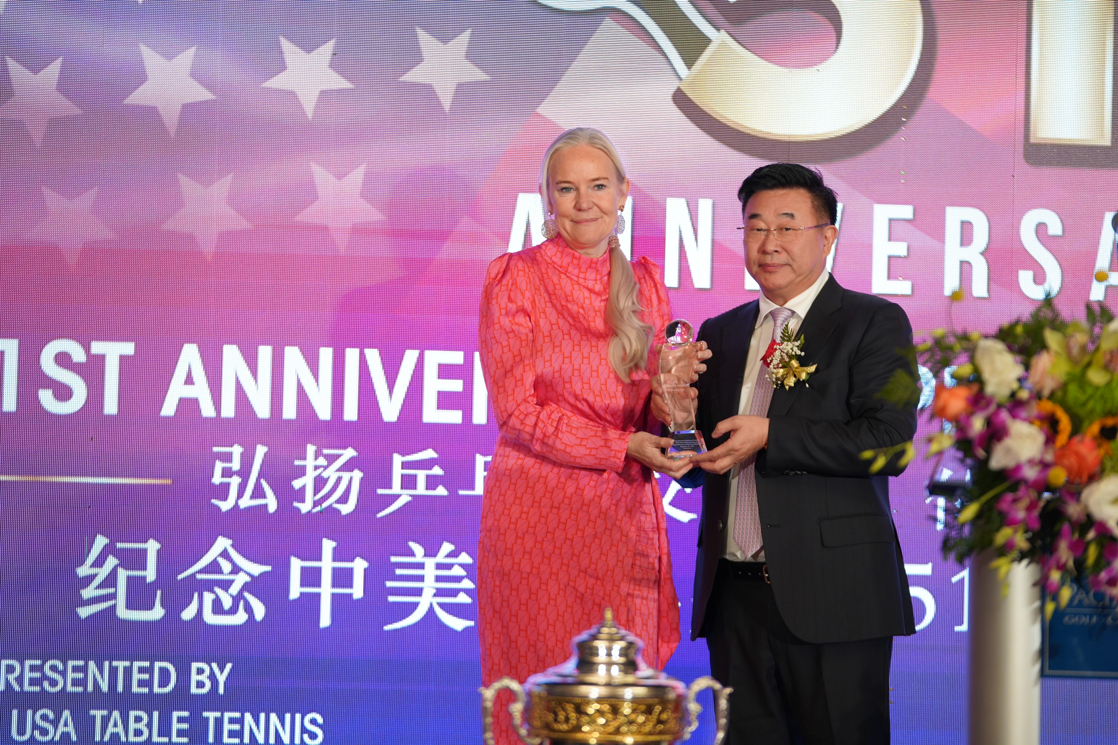 国际乒联主席 Petra Sorling向美国南加州华人华侨联合总会蔡成华会长颁发乒乓外交贡献奖