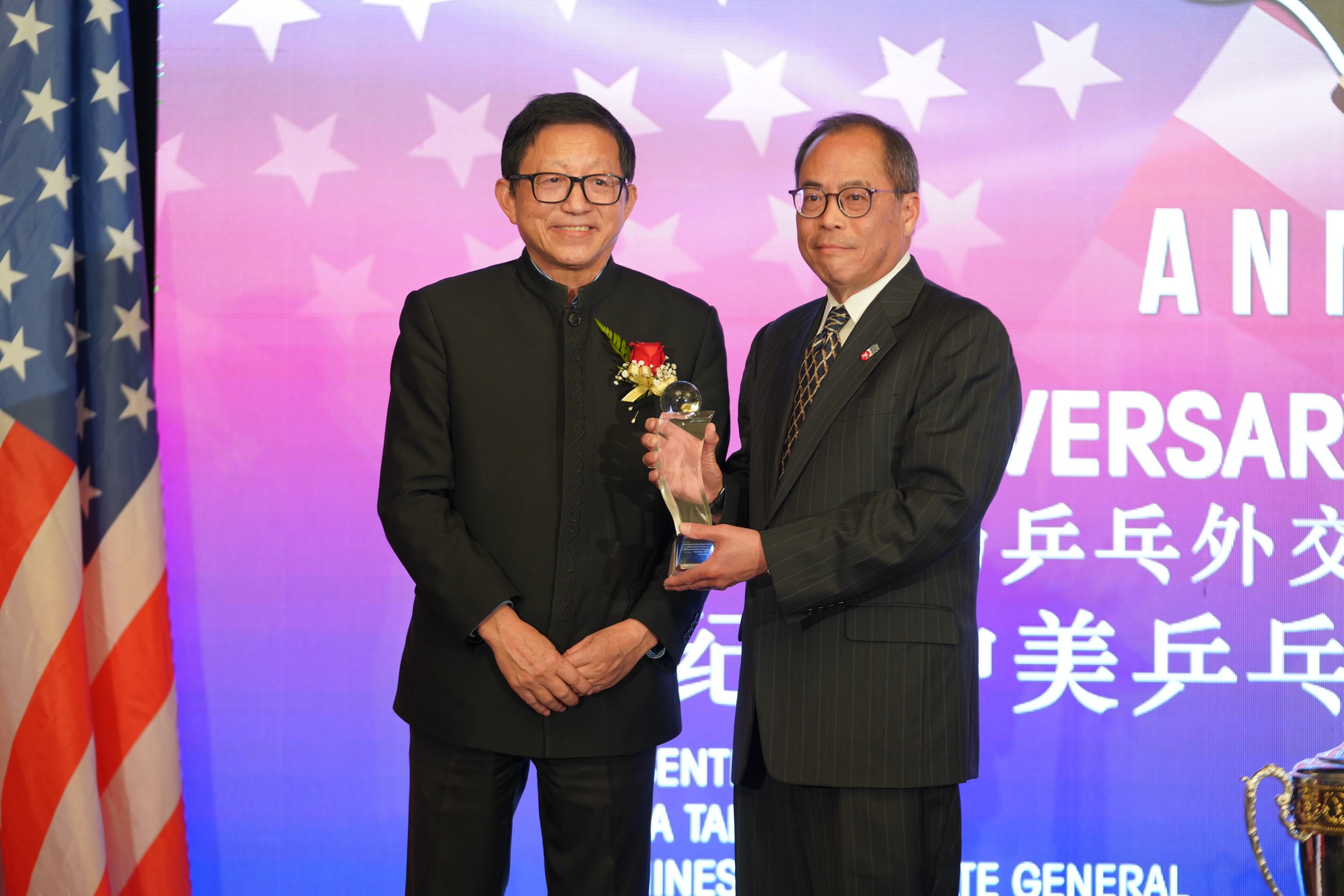 尼克松基金会董事、欧文银行副董事长、慈善家张祥华(Charlie Zhang)向美中关系全国委员会(NCUSCE) 副主席白莉娟(Jan Berris)颁发乒乓外交贡献奖;(美国乒协主席 Richard Char 代为接受)