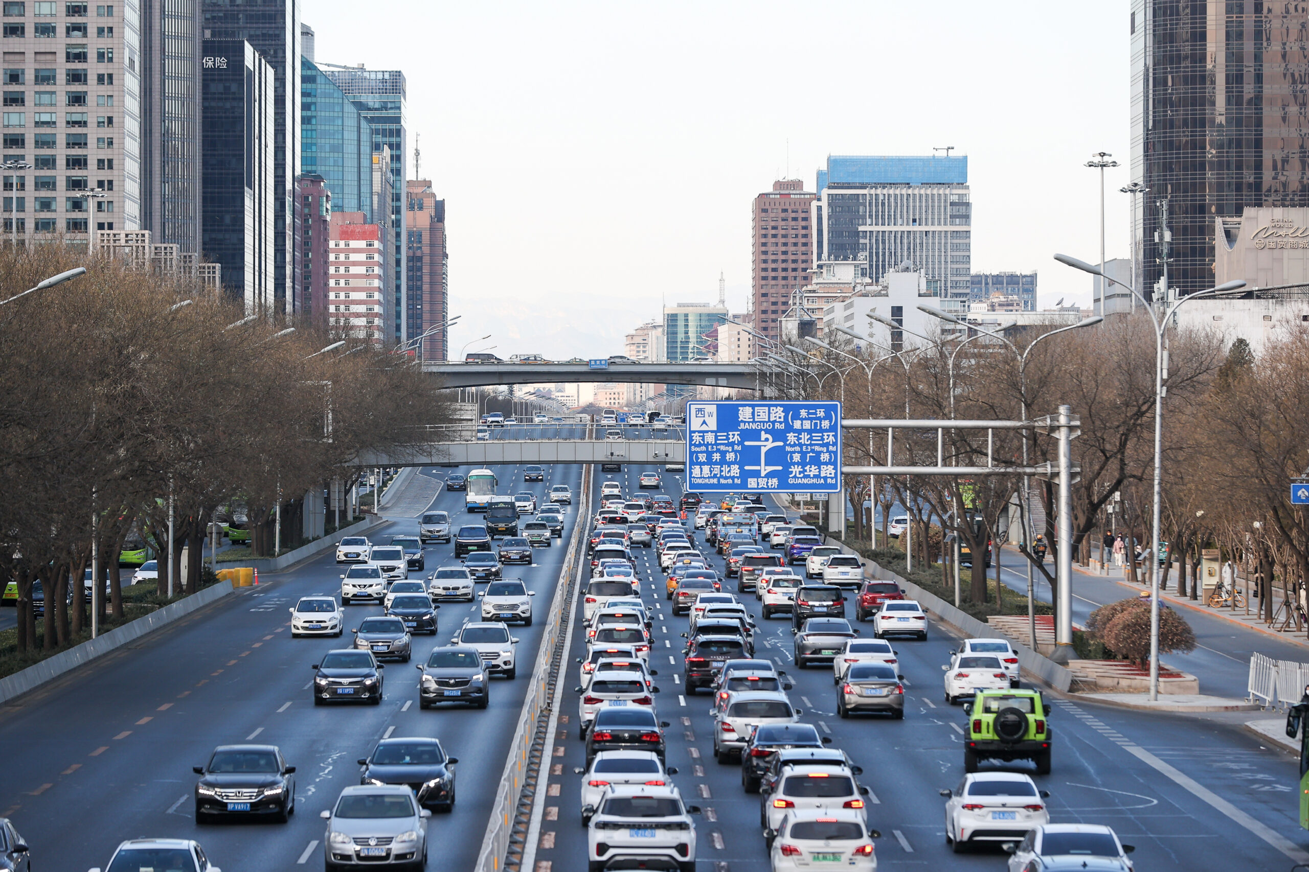12月21日,北京国贸桥附近车流量大。随着复工复产的有序推进,北京早高峰时段路面车流增多。