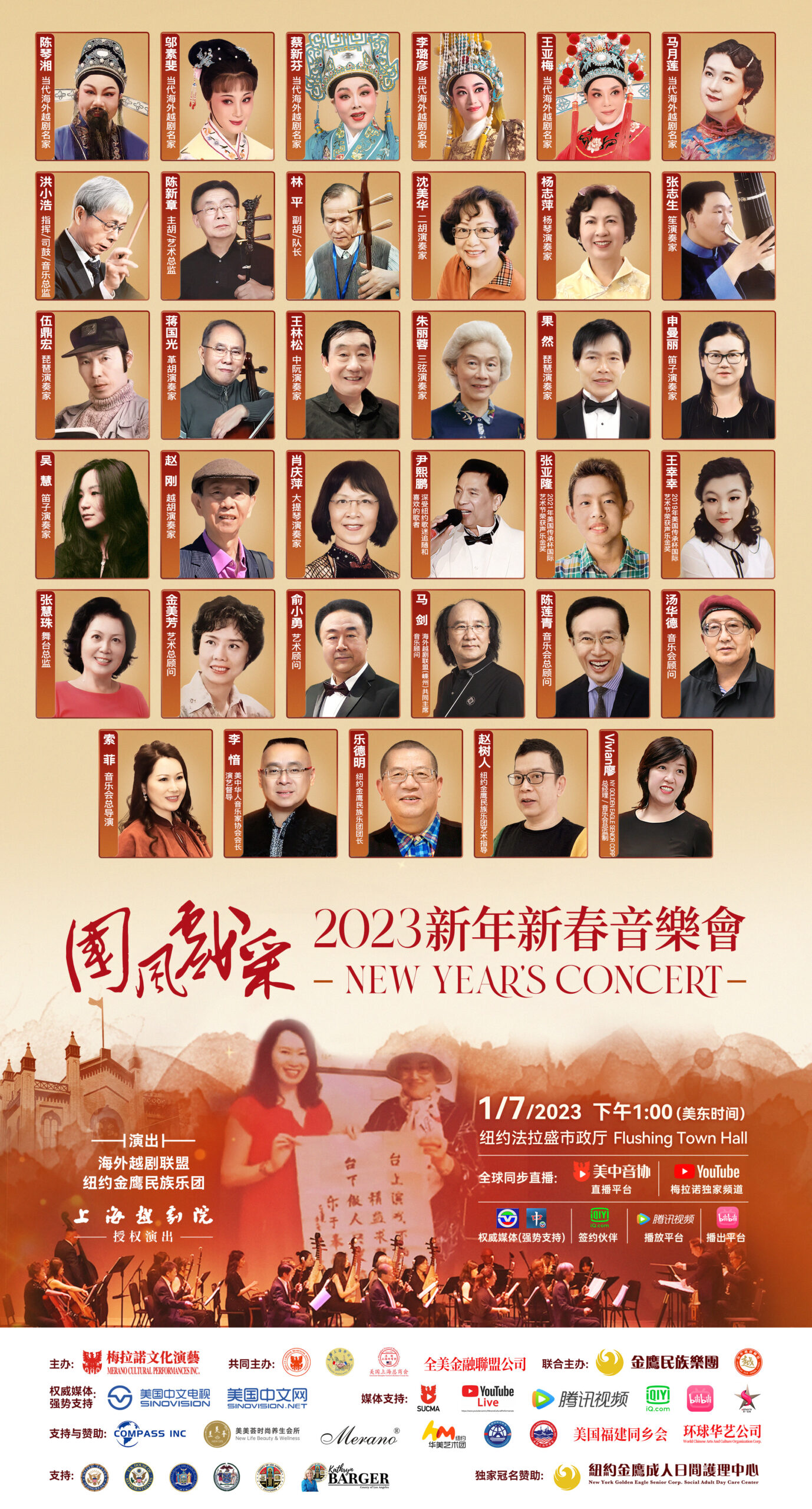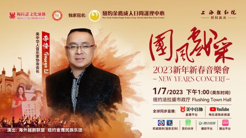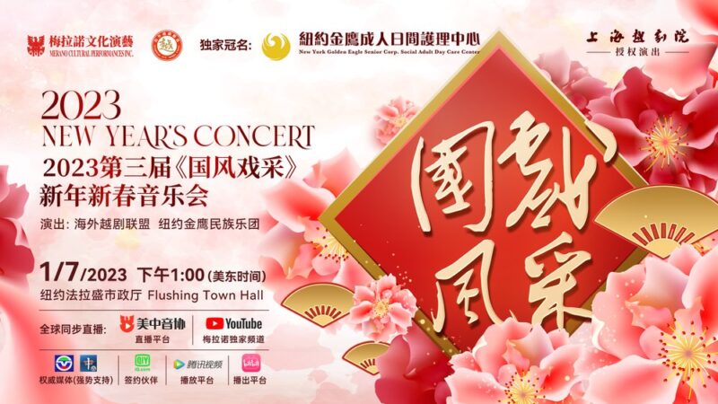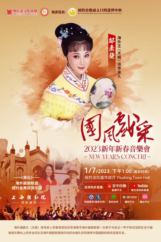 “庆新春迎兔年”由美国梅拉诺文化演艺集团主办,海外越剧联盟、纽约金鹰民族乐团和美中华人音乐家协会共同主办,New York Golden Eagle Senior Corp 独家冠名,上海越剧院授权演出的2023第三届“国风戏采”新年新春音乐会将定于2023年1月7日在美国纽约隆重举行。