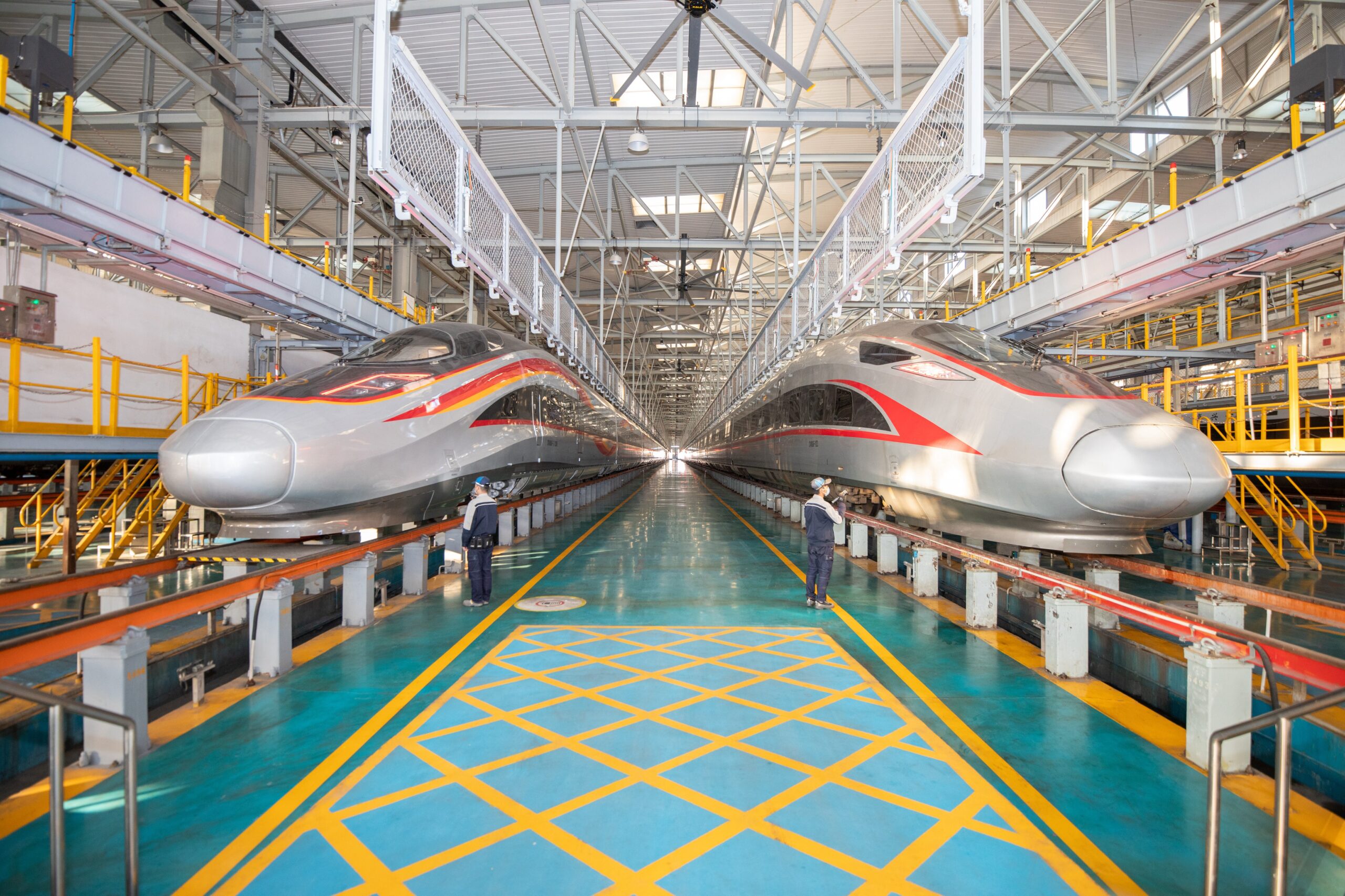 12月26日,广东省广州市,中国铁路广州局集团有限公司开始实行新列车运行图。新运行图实施后,22组复兴号智能动车组将陆续落户广铁,成为广东、湖南高铁“朋友圈”的新成员。图为广州动车段广州南动车所地勤机械师正在立岗接车。
