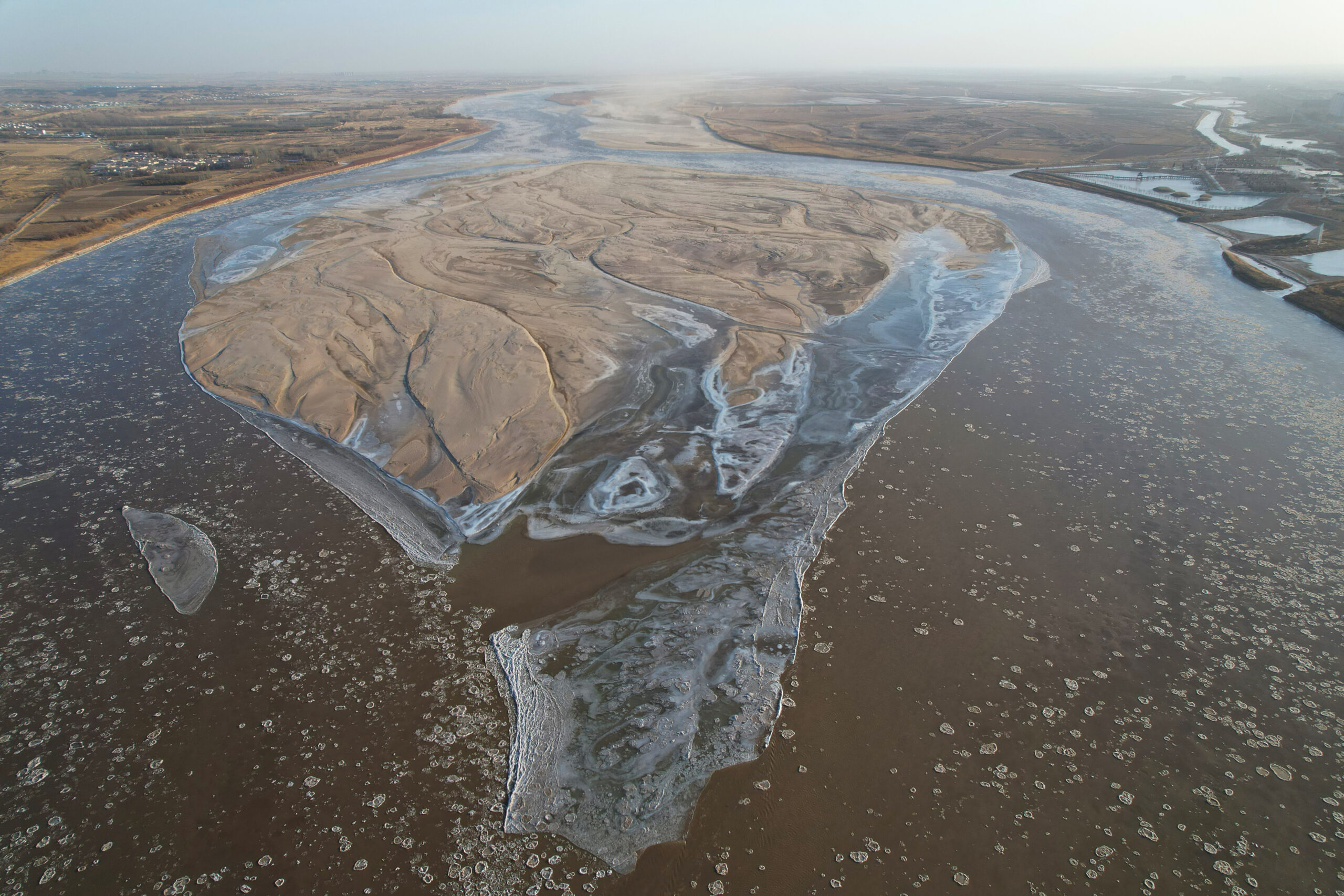 12月27日,航拍宁夏石嘴山市惠农区的黄河流凌景观。近日,随着气温下降,黄河宁夏段出现流凌景观。