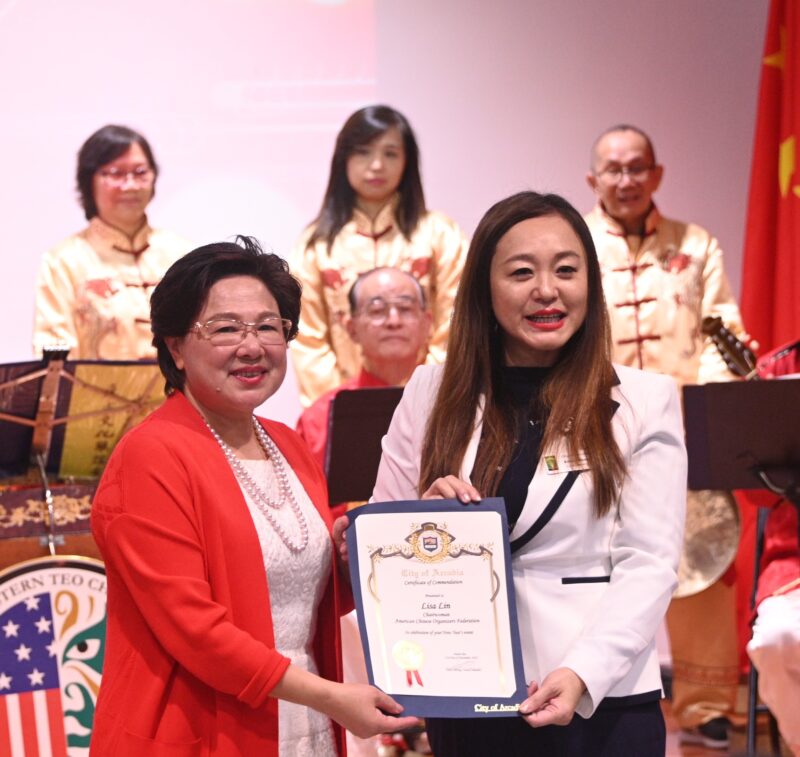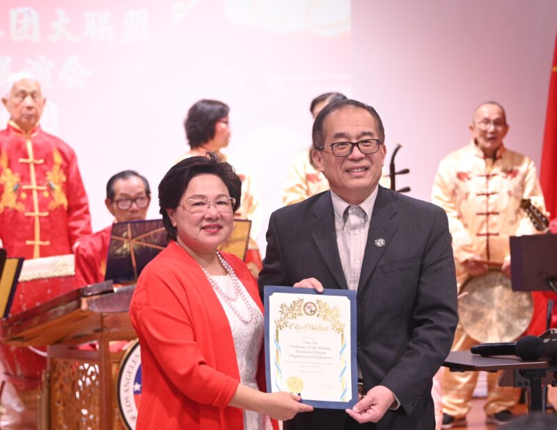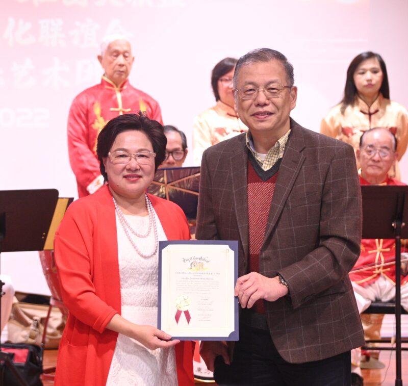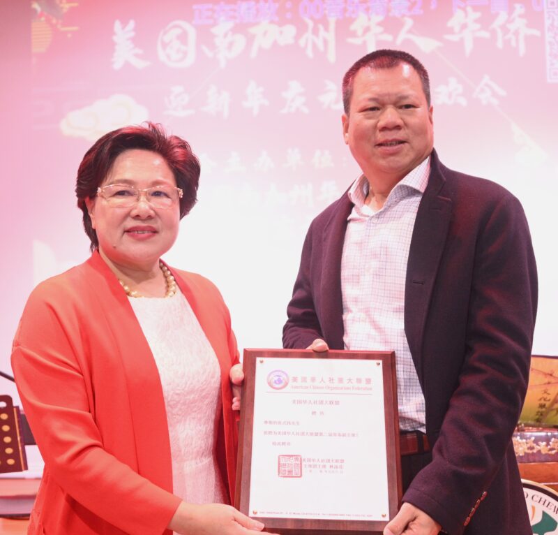 加州众议员方树强向大联盟主席林淦花等頒賀狀