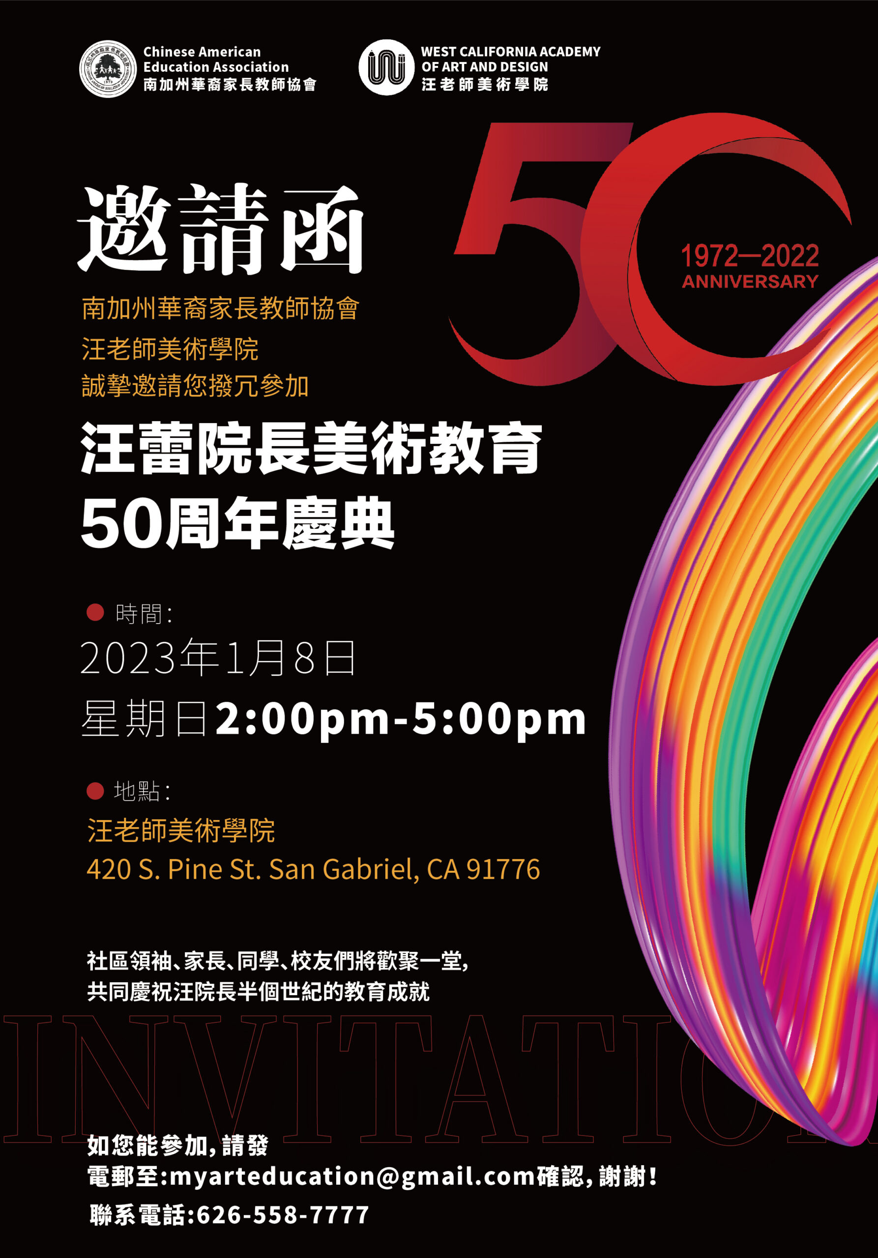 南加州华裔家长教师协会和汪老师美术学院诚挚邀请您拨冗参加“汪蕾院长美术教育50周年庆典(1972-2022)”活动。