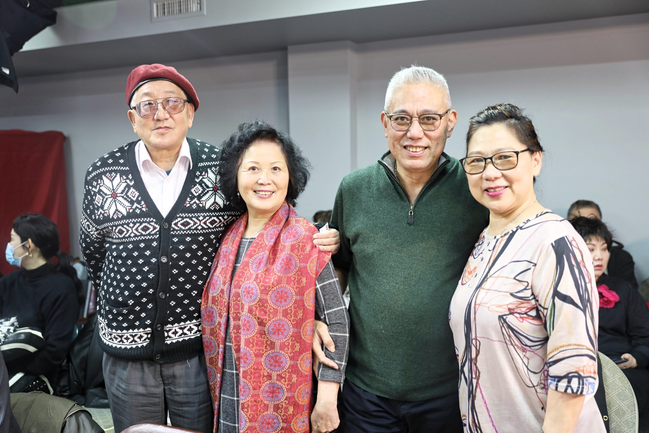 值得一提的是,在纽约地区有几位原上海越剧院乐队的前辈,目前是海外越剧联盟纽约站的戏曲音乐演奏家,他们的这支乐队名叫一甲子中流砥柱乐队,他们的艺令都超过60年,他们是音乐总监/司鼓洪小浩,艺术总监/主胡陈新章,主胡/赵刚,乐队队长/副胡/林平,琵琶演奏家/伍鼎宏,弹拨乐演奏家/王林松,革胡演奏家/蒋国光先生,唢呐演奏家/李思连老师和杨琴演奏家康志先生。