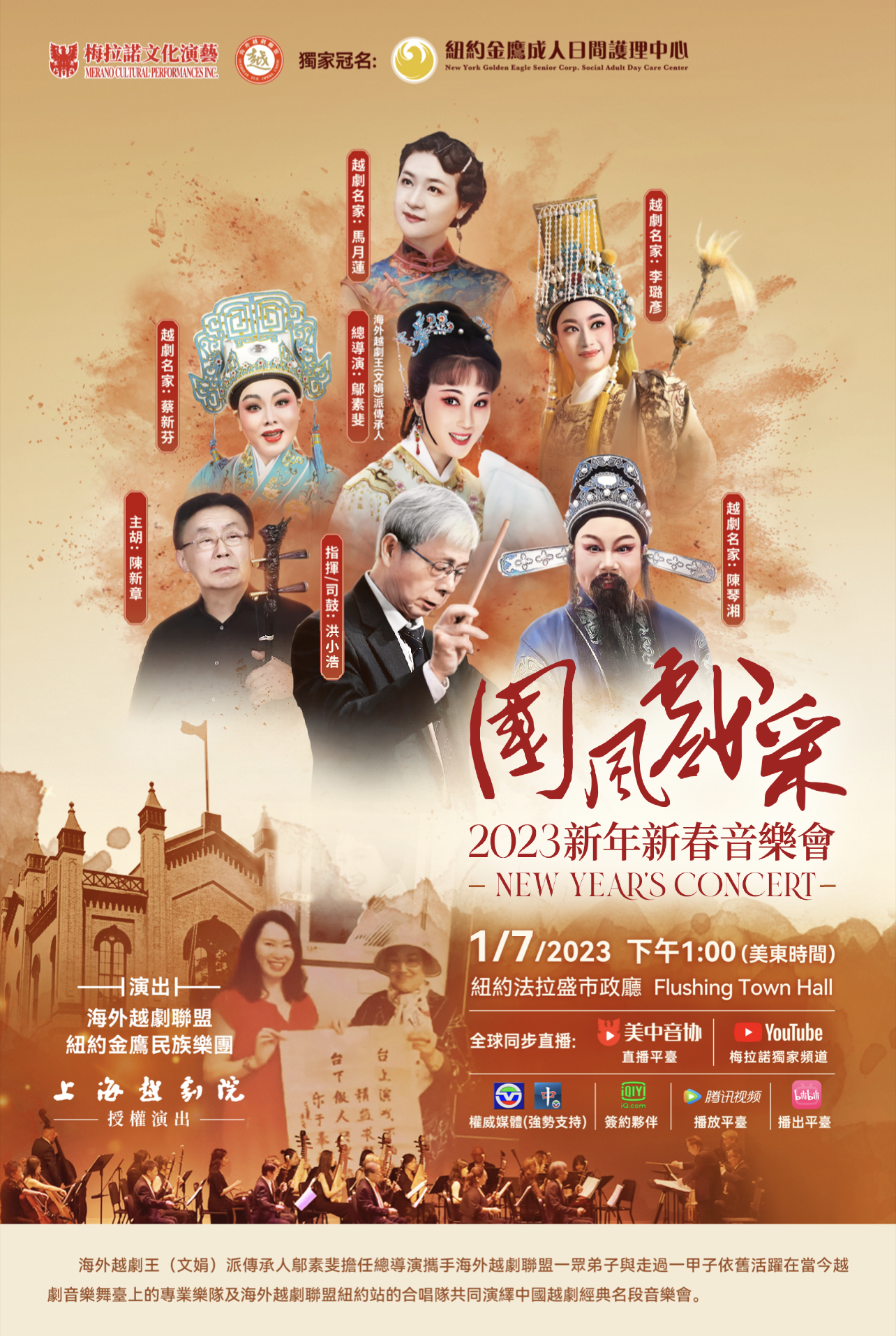 “ 庆新春迎兔年” 由美国梅拉诺文化演艺集团主办,海外越剧联盟、纽约金鹰民族乐团联合主办,美中华人音乐家协会、美国金融联盟公司、美国上海联谊会和美国上海总商会共同主办,纽约金鹰成人日间护理中心独家冠名,上海越剧院授权演出的2023第三届“国风戏采”新年新春音乐会将定于2023年1月7日在美国纽约法拉盛市政厅隆重举行。
