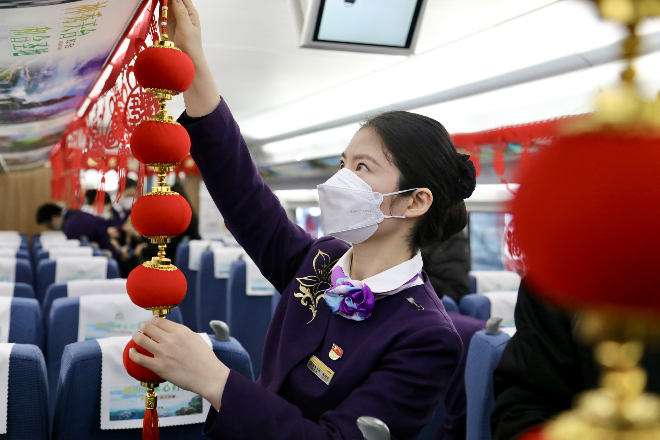 1月6日,乘务人员用灯笼、剪纸等物品布置车厢。当日,在合肥南开往合肥南的G8341次环线高铁上,中国铁路上海局集团有限公司合肥客运段的乘务员们在车厢内与旅客欢聚一堂。2023年春运将于1月7日启幕,2月15日结束,共计40天。