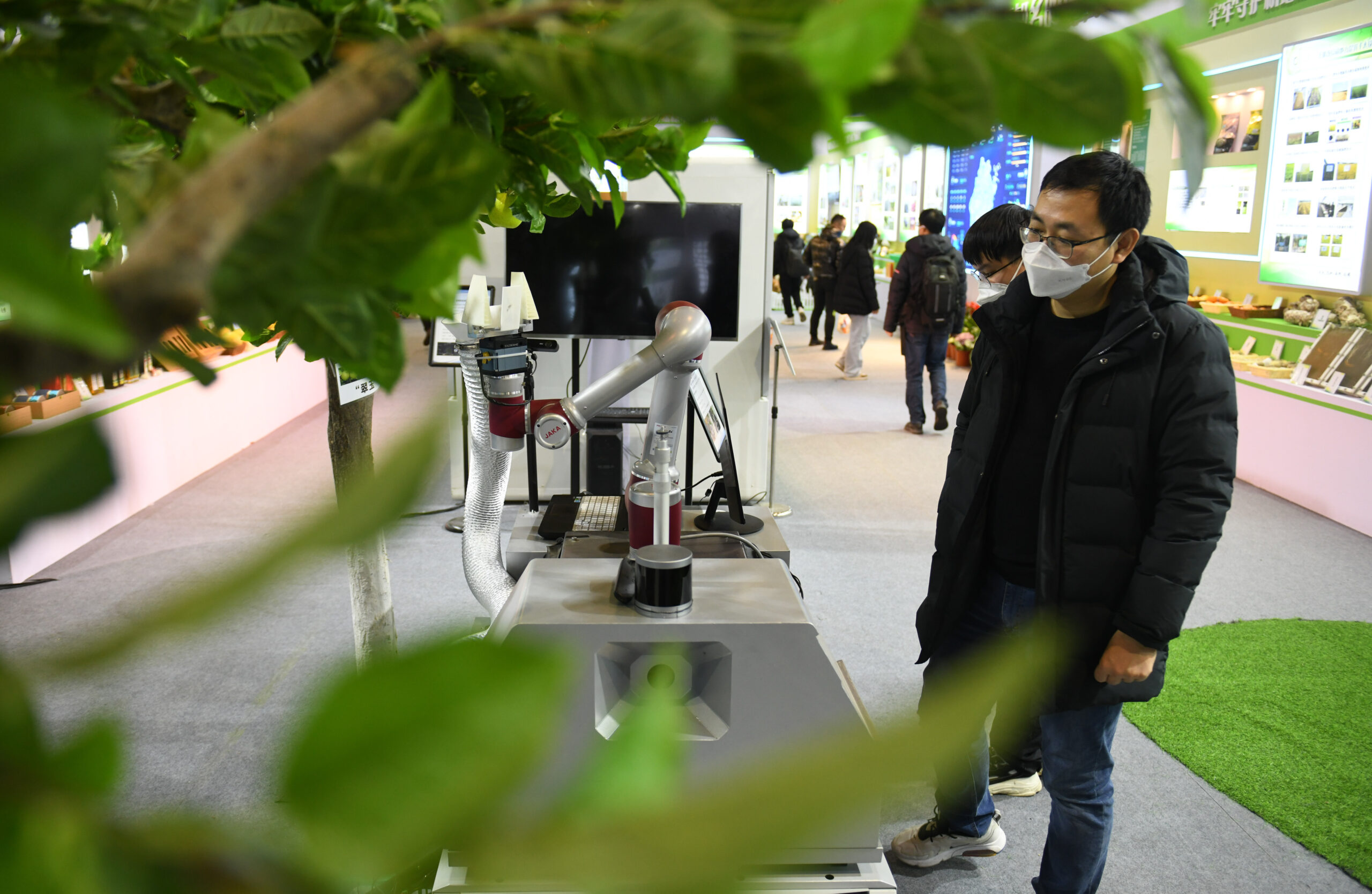 1月11日,展出的智能化梨采摘机器人吸引参观者。近日,2022浙江农业博览会在杭州举行,现场展出的乡村大脑、巡逻机器人、农业无人机等科技装备吸引参观者。