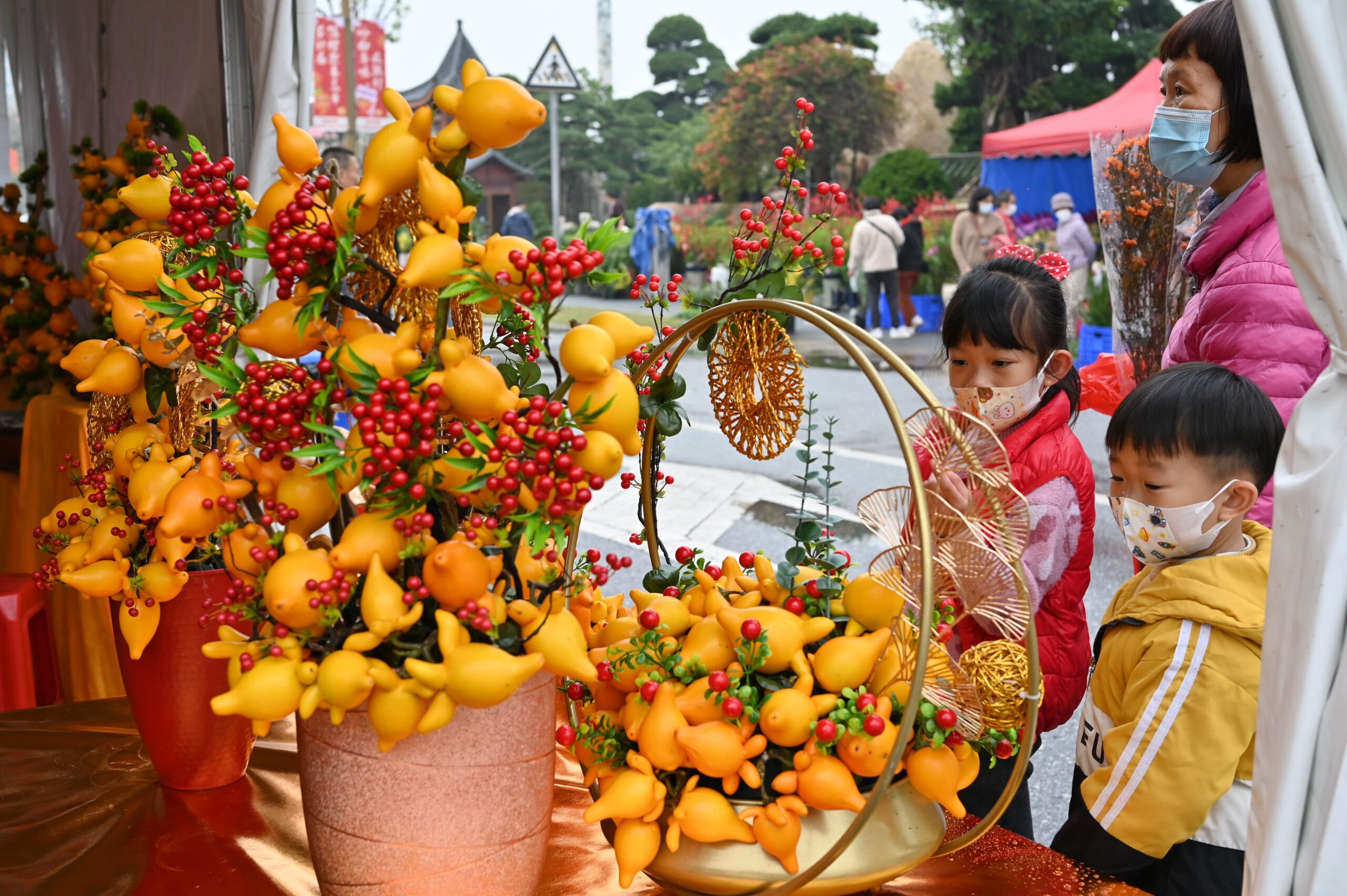 1月12日,广东佛山,民众在第39届陈村迎春花市选购年宵花。1月11日至20日,第39届陈村迎春花市在陈村花卉世界芳华大道开展,该花市设置“十里花街”,重现佛山最大花市,其中包含年桔塔、阳台花园等景观。