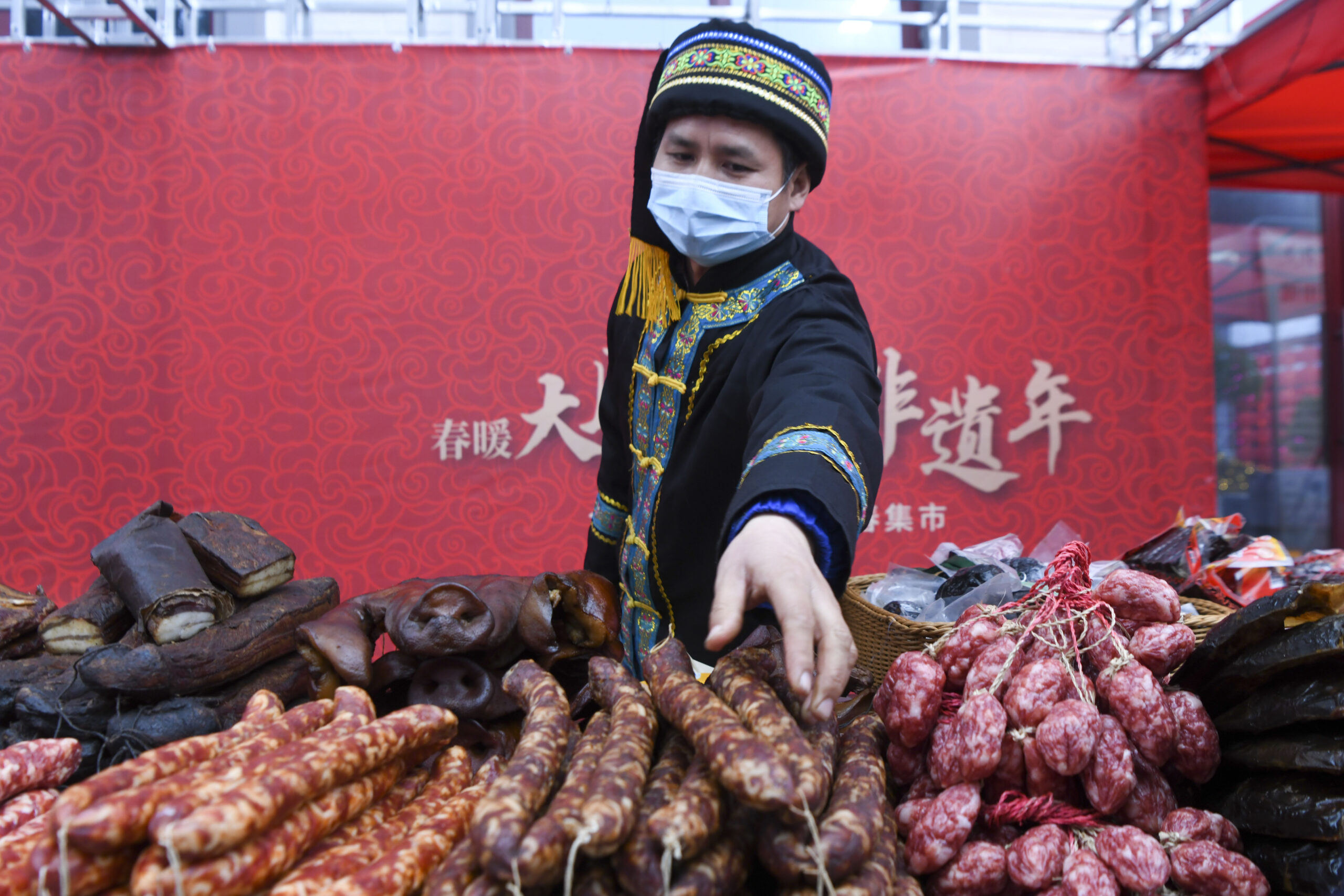 1月13日,苗家人在集市售卖腊味品。当日,2023湖南非遗新春集市活动在长沙举行,湖南的130余个非遗项目共同为市民奉上了一场盛大的非遗新春礼。 未经允许不得转载:城市新闻网icitynews » 长沙:非遗新春集市迎新春