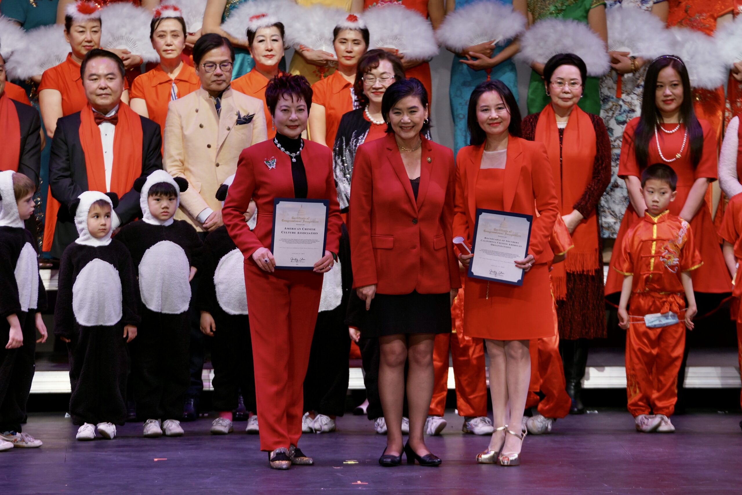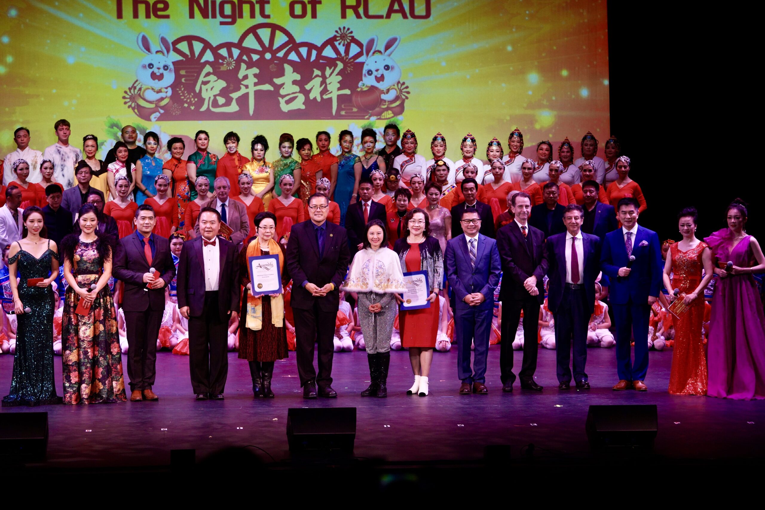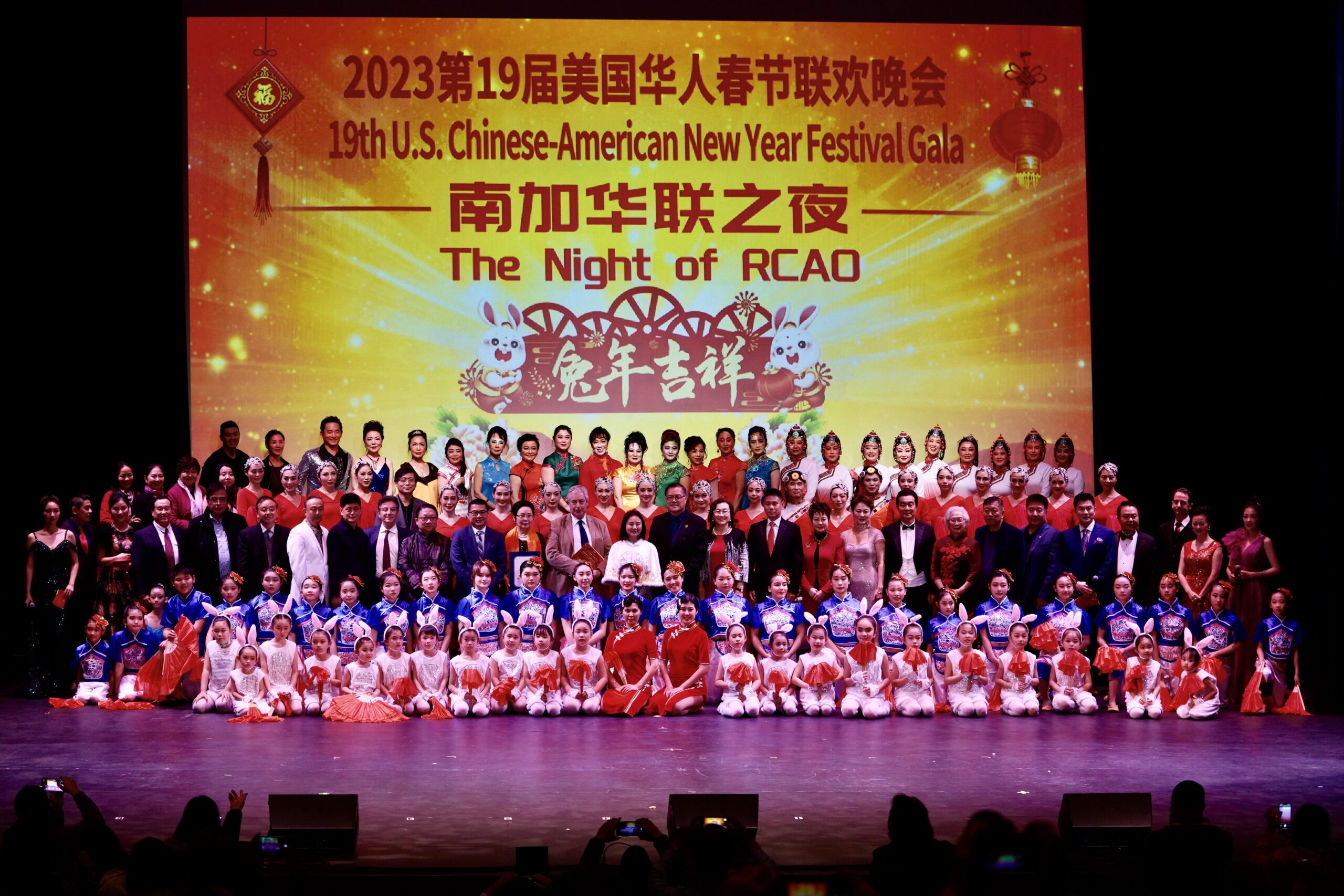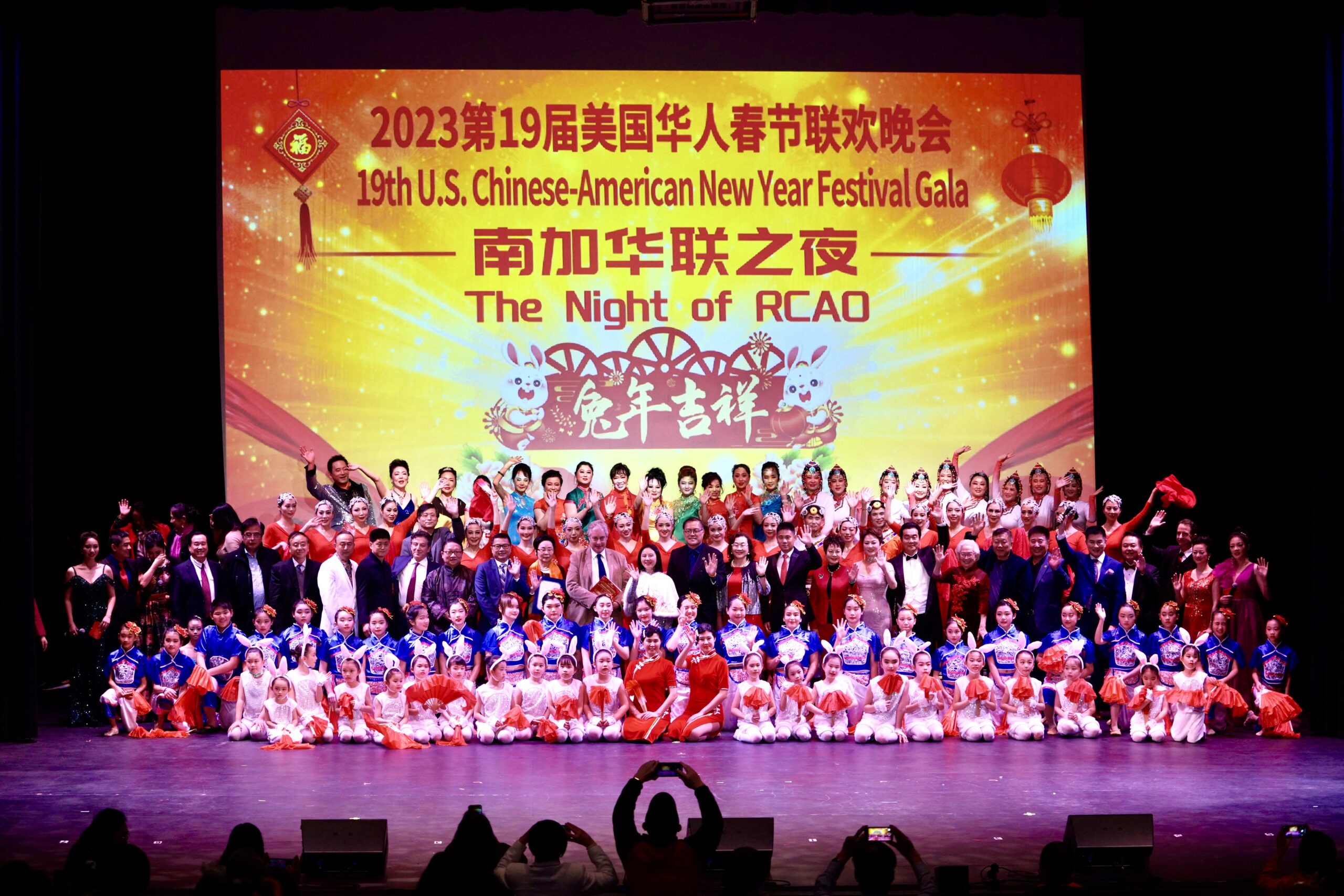 晚会主席与各位嘉宾在晚会上登台以各种形式表现喜迎新春并向在场的观众拜年。晚会充分展现南加华联和嘉宾们在农历新年期间对华人华侨、对家人和朋友的美好祝福,共同祝愿大家兔年新春快乐。