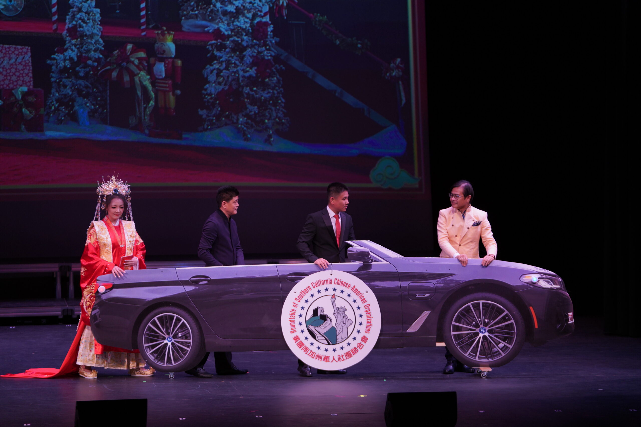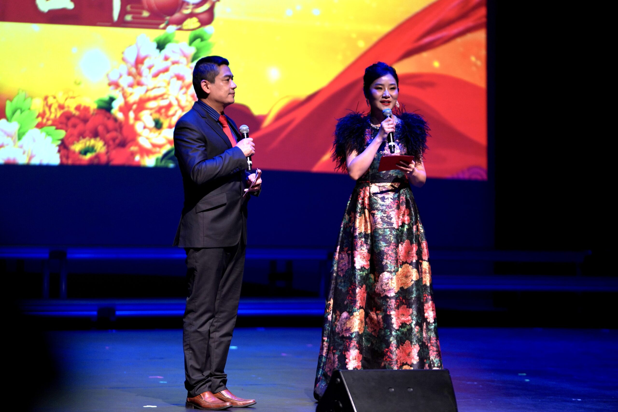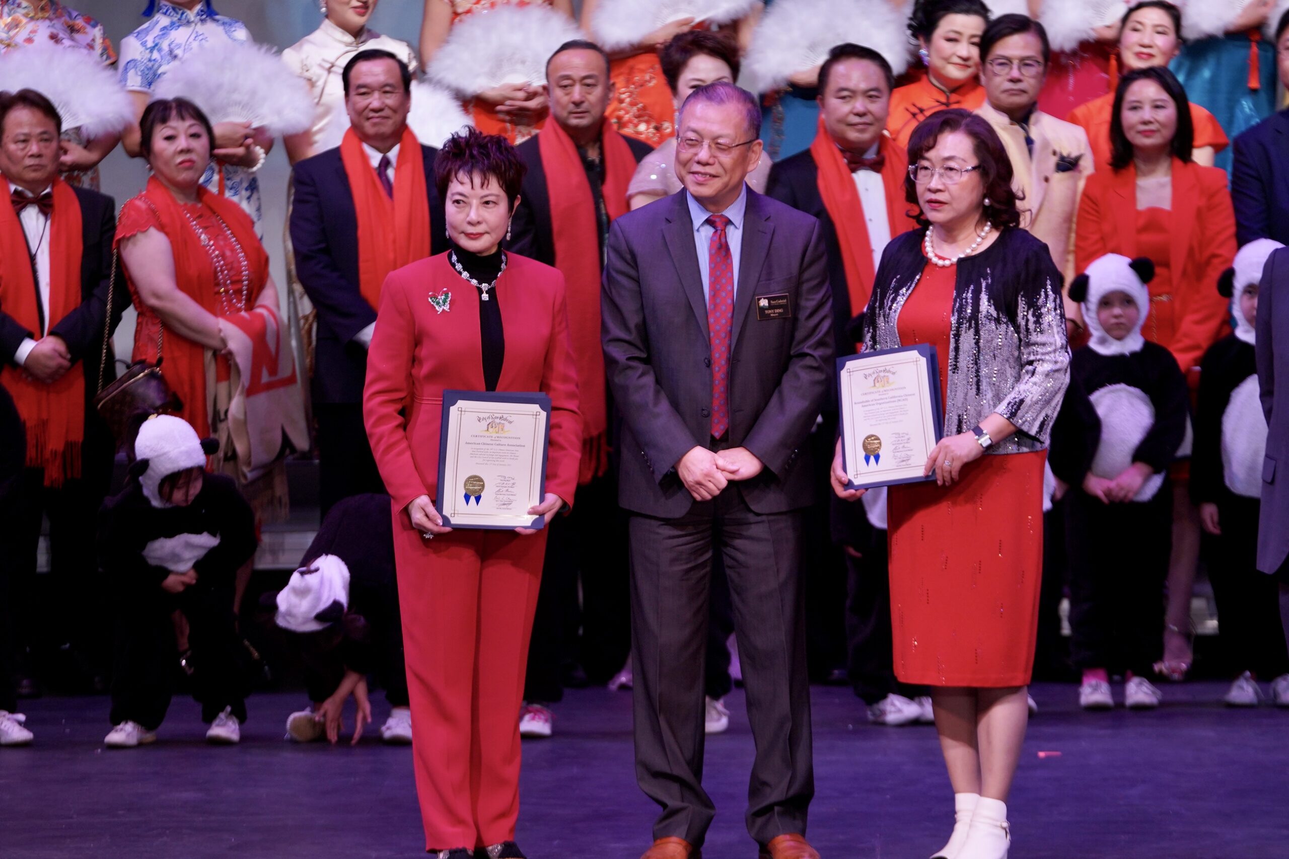 晚会主席与各位嘉宾在晚会上登台以各种形式表现喜迎新春并向在场的观众拜年。晚会充分展现南加华联和嘉宾们在农历新年期间对华人华侨、对家人和朋友的美好祝福,共同祝愿大家兔年新春快乐。