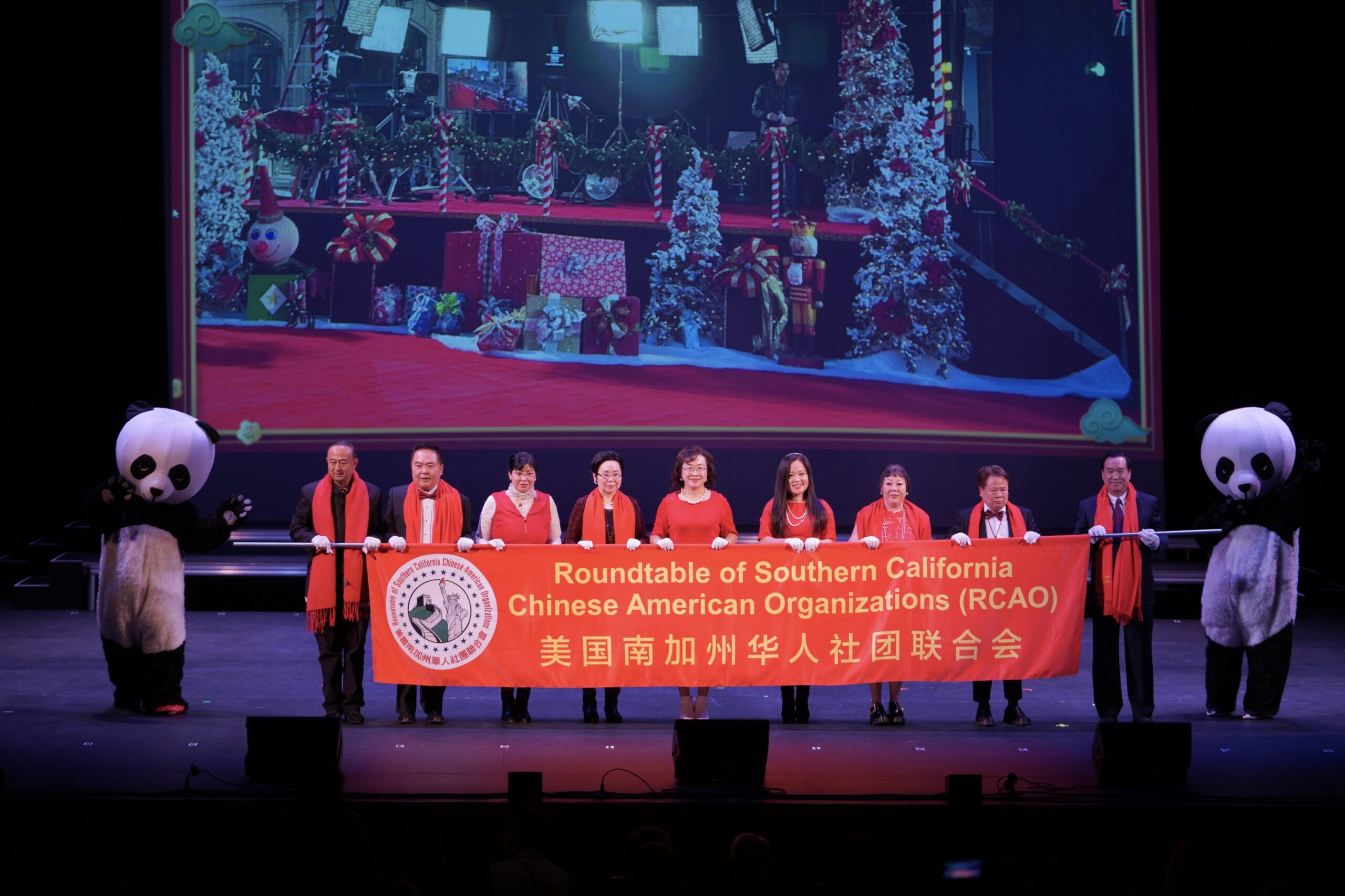 随后,晚会嘉宾登场致辞,包括:南加华联主席/圣诞游行总策划/春晚晚会主席兼总策划陈慧碧、中华人民共和国驻洛杉矶总领事馆副总领事李春林、美国国会众议员赵美心(Judy Chu)、晚会主席/美中文化协会会长与中美文化交流协会王蜀通过视频方式致辞、晚会主席/美国鹰龙传媒公司董事长苏彦韬、晚会主席/中国工商银行南加州负责人何建中、晚会主席/美国巾帼会会长杨弼、南加州促统论坛总召集周德昭。