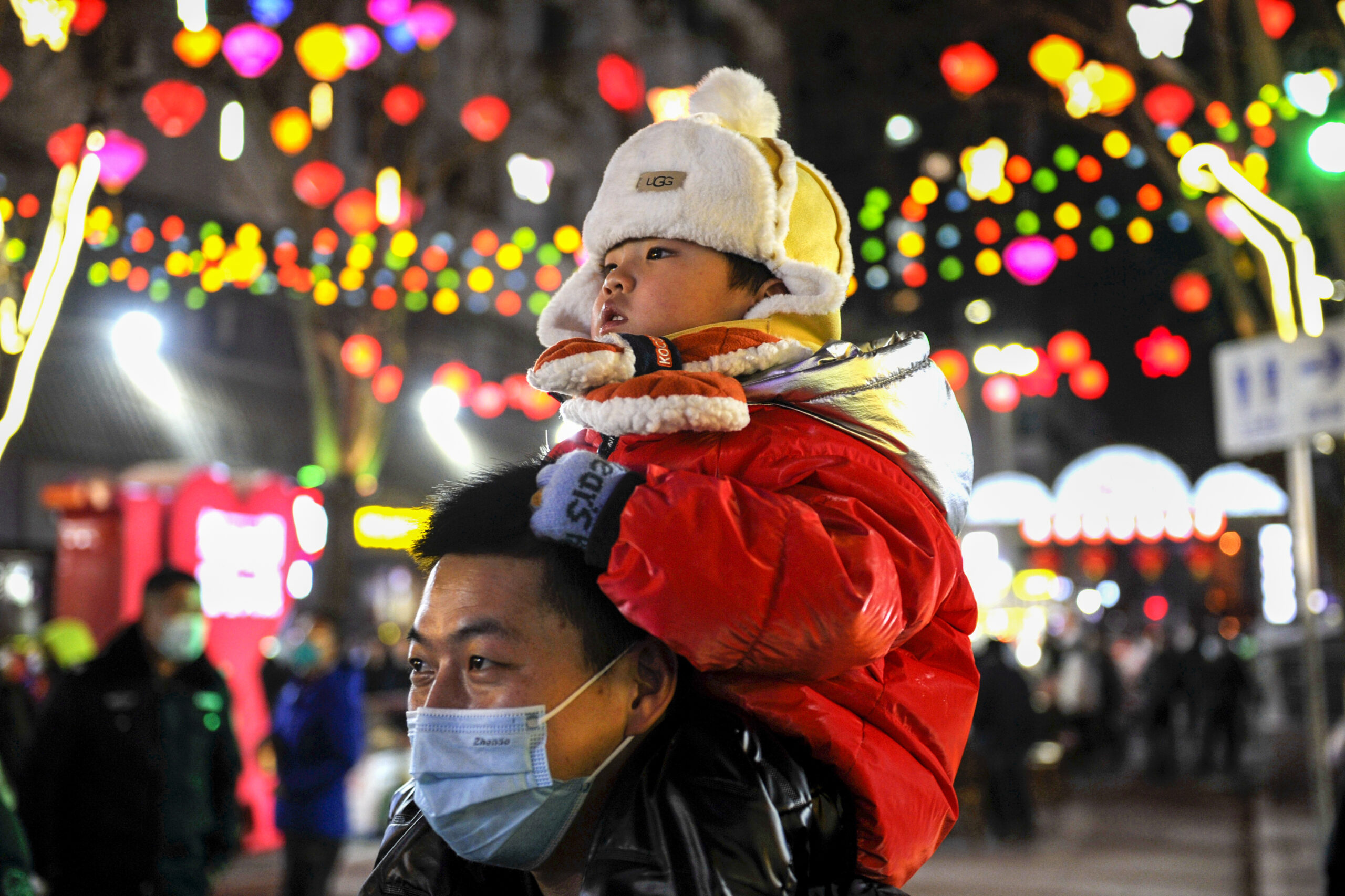 1月16日,陕西延安,市民带领孩童逛夜市。春节将至,陕西延安年味渐浓,民众来到延州二道街夜市品尝特色美食。