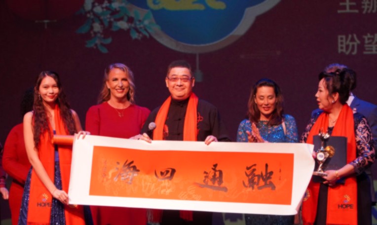 主持人向大家献上祝福。郡长预祝晚会圆满成功,亲临现场的有圣盖博市长Tony Ding,亚凯迪亚市议员王爱琳,前核桃市市长苏王秀兰,拉米娜达市长,Jenny Rae Le Roux for California Governor,Mike Cargile for congress district 35,并发表致辞,衷心祝愿在美华人中国新春快乐!大力赞扬和肯定了盼望之家HOPE CENTER对美国社会所作出的贡献。 William hung, American idol contestant和LABA国际艺术节创会主席,好莱坞国际双语主持人周正先生代表轮值主席黄建南伯爵特别给Hope Center&美国艺术银行董事长周萍博士颁发艺术特殊贡献奖。由盼望之家HOPE CENTER主办”春带福路”2023华人春节联欢晚会主席周萍博士说:“在美华人春晚是一次海外华人盛大演岀,传播中国好声音,让我们在异国他乡强烈地感受到春节的喜悦,一场精彩纷呈的艺术大餐,舞台背景绚丽多彩,灯光吊屏璀璨夺目,一个个精彩节目轮番登场,在欢乐祥和的喜庆氛围里共迎新春!